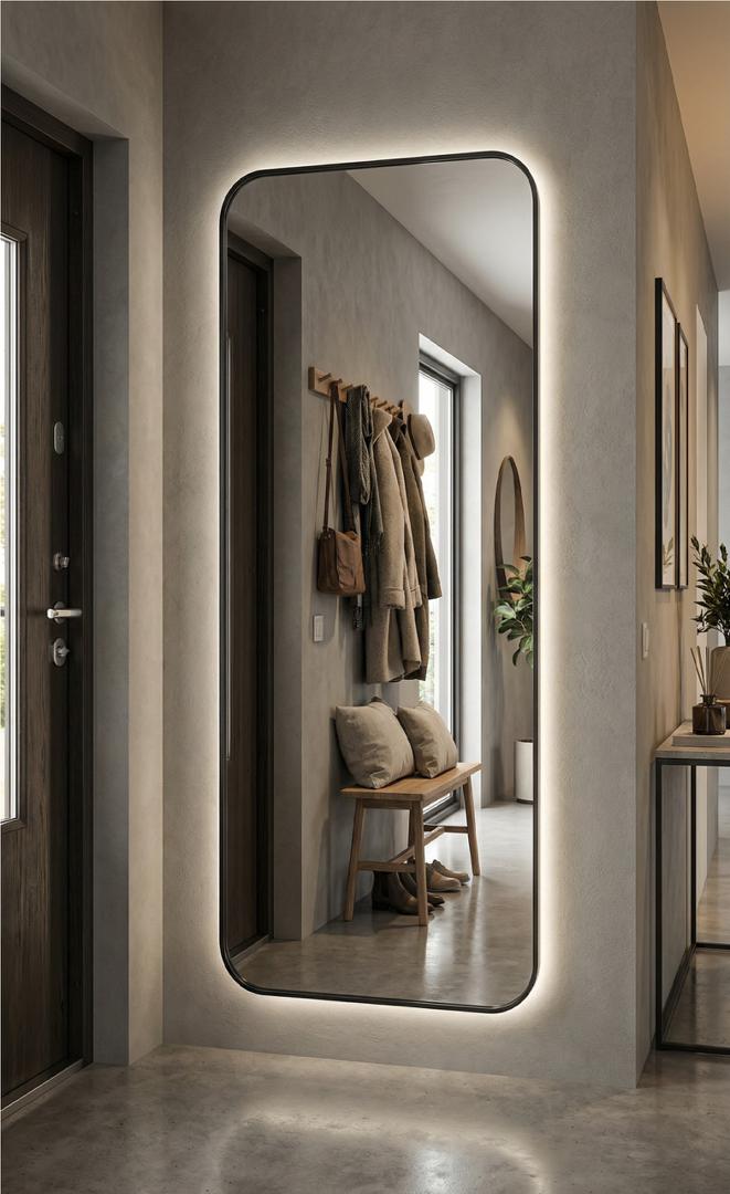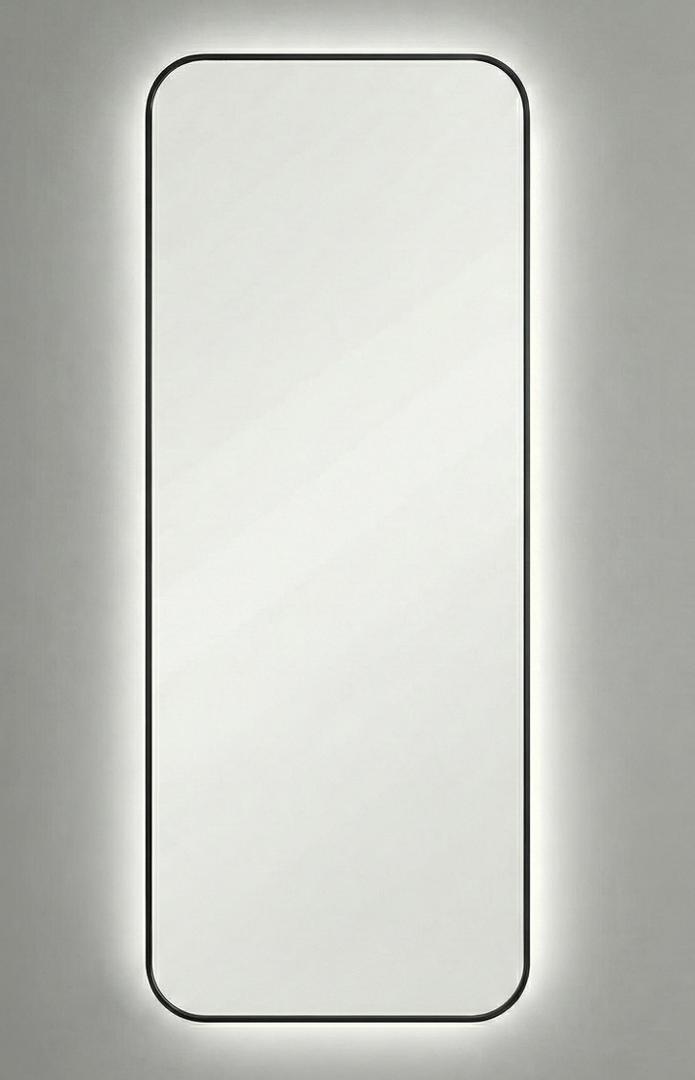 Зеркало в тонкой раме с интерьерной, фоновой подсветкой, рассотяние от стены всего 9 мм. Премиум лента COB со сплошным свечением, встроенный плоский блок питания 12V с влагозащитой IP67, работа от внешнего выключателя или шнура 220V (идет в комплекте). Температура свечения на выбор 3000K, 4000K, 6000K. Изделия можно использовать в помещениях с повышенной влажностью до 70%. Навешивается вертикально и горизонтально.