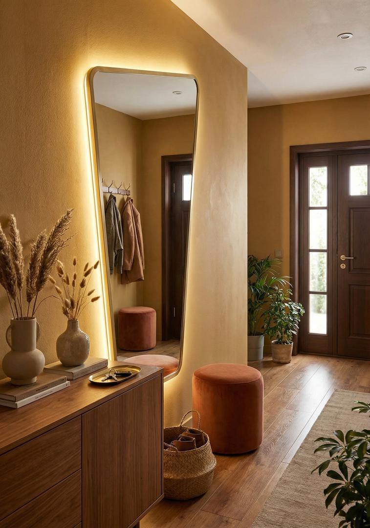 Зеркало в тонкой раме с интерьерной, фоновой подсветкой, рассотяние от стены всего 9 мм. Премиум лента COB со сплошным свечением, встроенный плоский блок питания 12V с влагозащитой IP67, работа от внешнего выключателя или шнура 220V (идет в комплекте). Температура свечения на выбор 3000K, 4000K, 6000K. Изделия можно использовать в помещениях с повышенной влажностью до 70%.