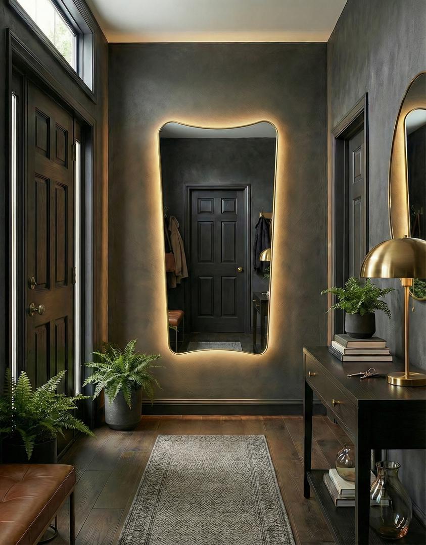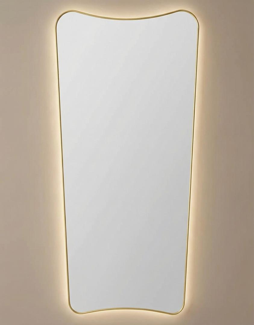 Зеркало в тонкой раме с интерьерной, фоновой подсветкой, рассотяние от стены всего 9 мм. Премиум лента COB со сплошным свечением, встроенный плоский блок питания 12V с влагозащитой IP67, работа от внешнего выключателя или шнура 220V (идет в комплекте). Температура свечения на выбор 3000K, 4000K, 6000K. Изделия можно использовать в помещениях с повышенной влажностью до 70%.