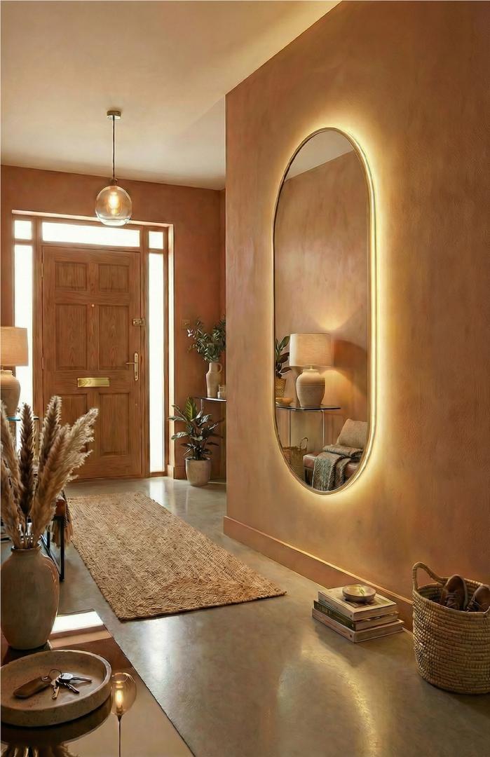 Зеркало в тонкой раме с интерьерной, фоновой подсветкой, рассотяние от стены всего 9 мм. Премиум лента COB со сплошным свечением, встроенный плоский блок питания 12V с влагозащитой IP67, работа от внешнего выключателя или шнура 220V (идет в комплекте). Температура свечения на выбор 3000K, 4000K, 6000K. Изделия можно использовать в помещениях с повышенной влажностью до 70%. Навешивается вертикально и горизонтально.