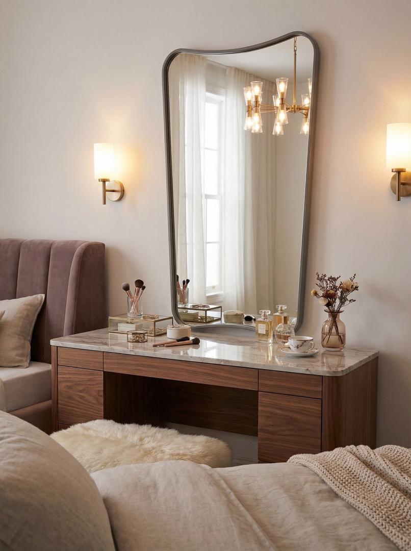 Тонкая рама, не закрывает край полированного зеркального полотна. Изделия можно использовать в помещениях с повышенной влажностью.