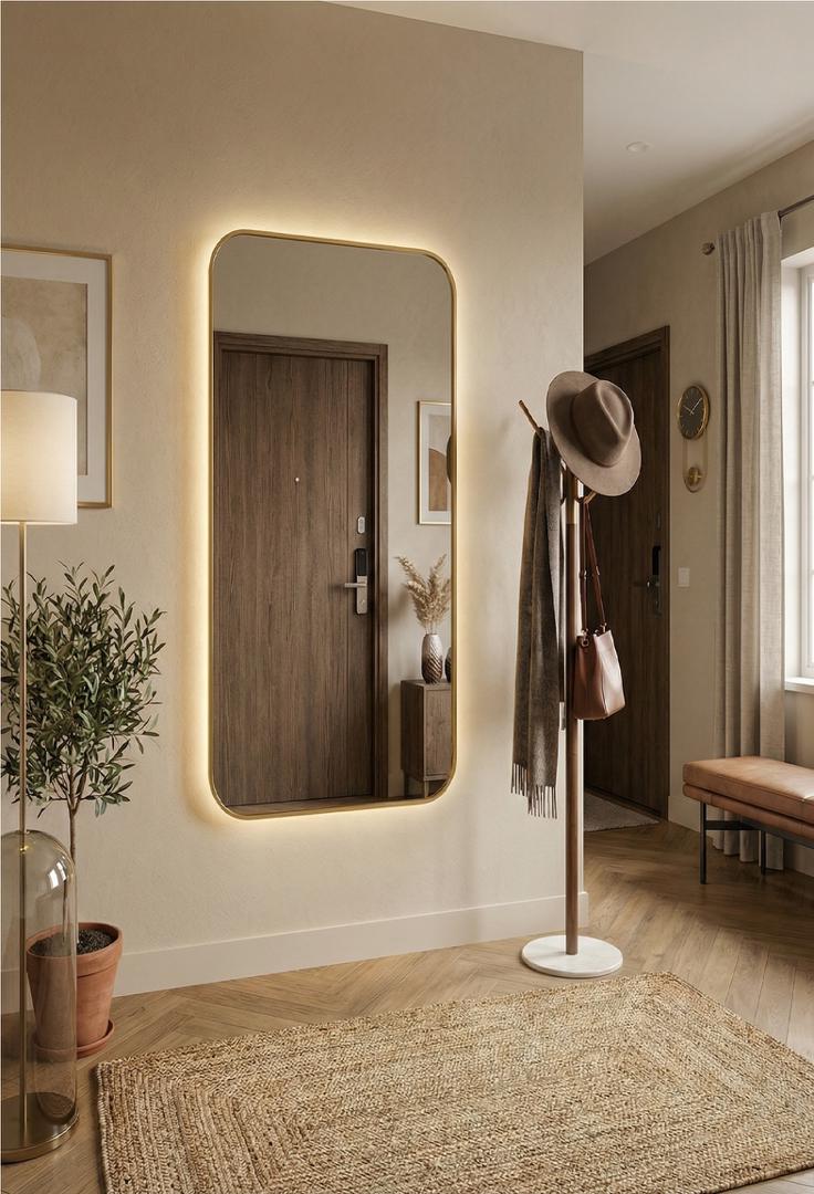 Зеркало в тонкой раме с интерьерной, фоновой подсветкой, рассотяние от стены всего 9 мм. Премиум лента COB со сплошным свечением, встроенный плоский блок питания 12V с влагозащитой IP67, работа от внешнего выключателя или шнура 220V (идет в комплекте). Температура свечения на выбор 3000K, 4000K, 6000K. Изделия можно использовать в помещениях с повышенной влажностью до 70%. Навешивается вертикально и горизонтально.