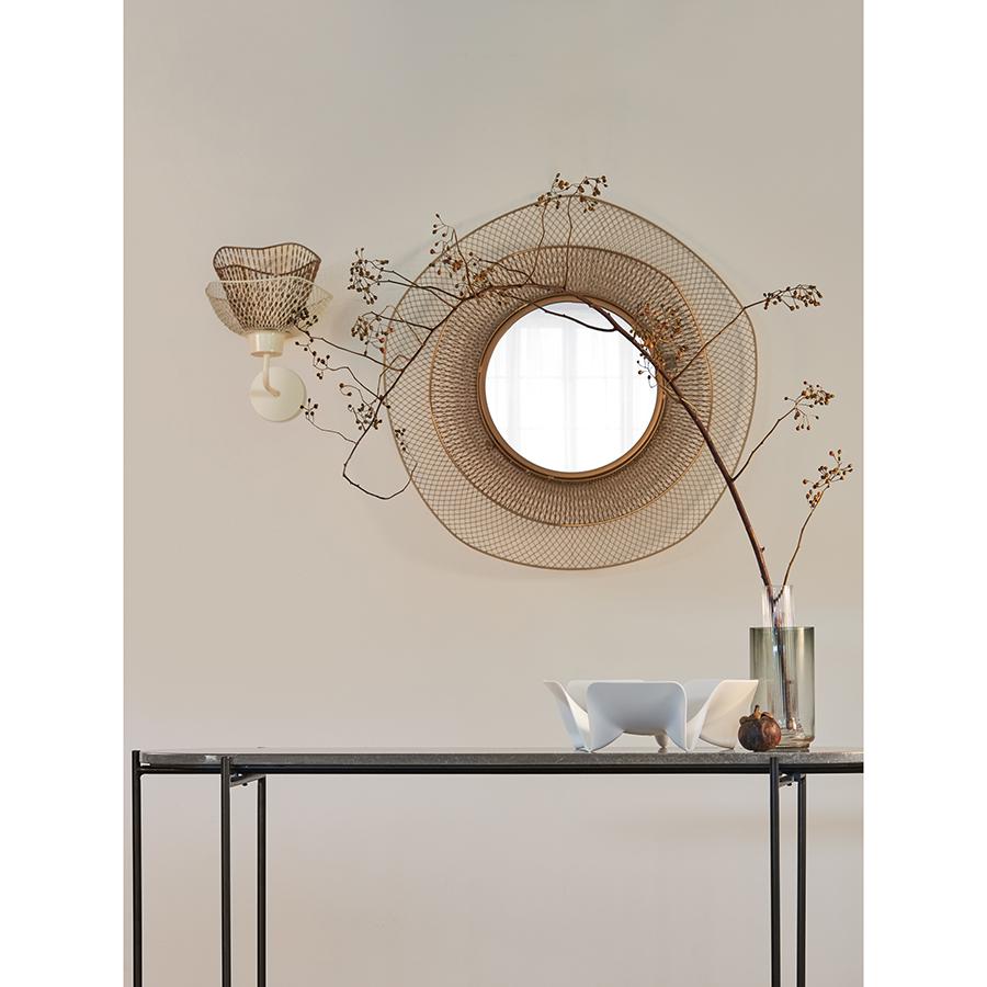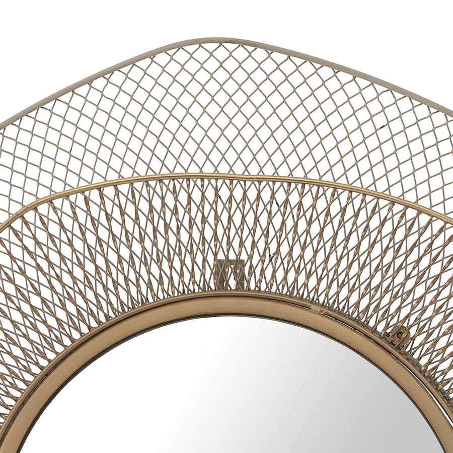 Зеркало Vinger способно преобразить любое помещение. Оно станет ярким акцентом в современных и минималистичных пространствах, добавит изысканность в классические и ретро-дизайны. Особенности и преимущества: - Зеркало круглой формы делает интерьер мягче и гармоничнее, отлично подчеркивает любой выбранный стиль. - Рама из железной сетки обеспечивает прочность и долговечность конструкции, а также создает элегантный и современный образ. - Настенный монтаж позволяет экономить место, что особенно актуально для малогабаритных помещений. Материалы: железо, стекло. Диаметр: 79 см. Цвет: бежевый/золотой. Пыль и загрязнения можно удалять при помощи мягкого влажного материала. Рекомендуется использовать средство для мытья зеркал.