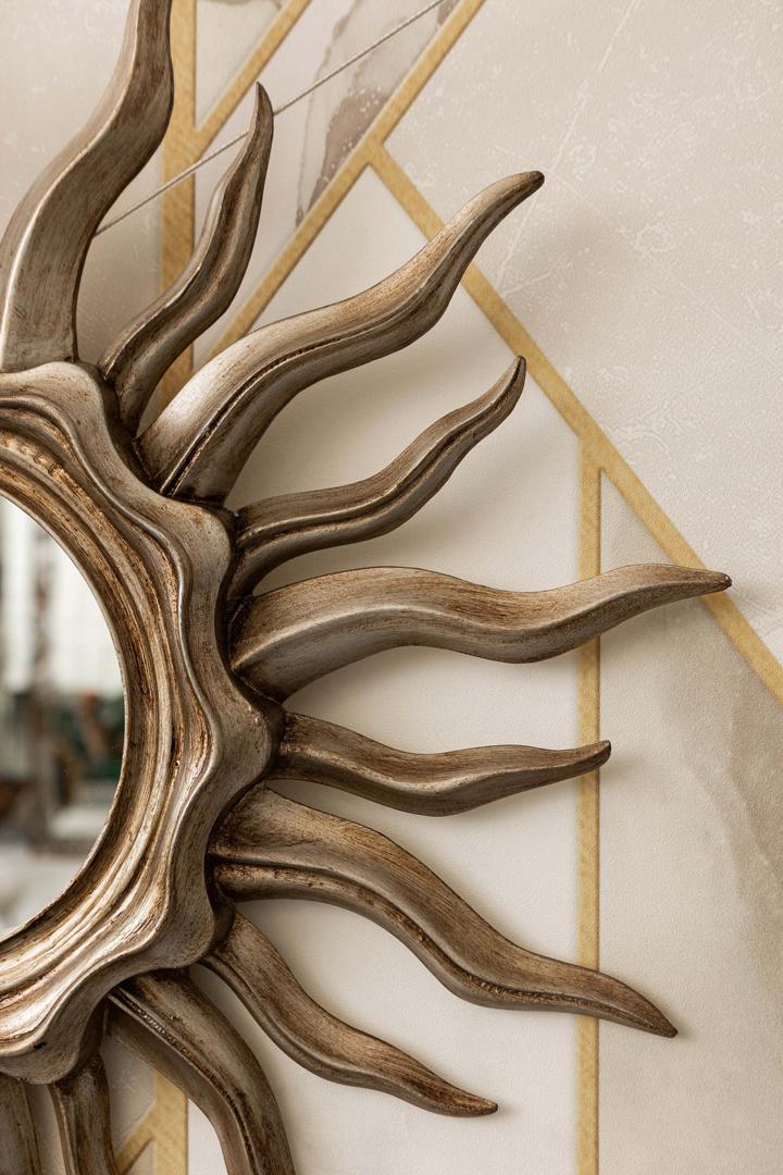 Зеркало De Soleil от производителя Bountyhome – зеркало ручной работы в форме солнца. В качестве рамы вы можете видеть резные лучи, фактурно выкрашенные в цвет состаренного серебра. Модель может быть выполнена в другом цвете.Возможно изготовление по Вашим цветам и размерам.Бренд: BountyHome.Страна изготовления: Россия.Материал: мдф, классическое зеркало.