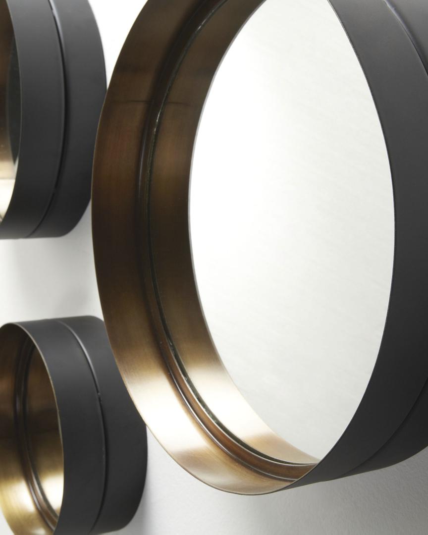 Комплект зеркал Wilson от фабрики La Forma (ex Julia Grup) — настоящая находка для украшения современной квартиры. Три минималистичных зеркала в металлической раме Wilson завораживают и восторгают созданным оптическим эффектом. Глядя в них, совершенно не понимаешь истинную ширину рамы, а игра черного и золотого — беспроигрышное цветовое решение, которое всегда притягивает взгляд. Этот комплект создан, чтобы стильно украсить современную квартиру. В зависимости от площади стены, каждое зеркало можно размещать на разном расстоянии и играть с их расположением. Кроме этого, они никак не скреплены друг с другом, поэтому при желании комплект можно разъединить и повесить по отдельности на смежные стены, комбинируя каждое изделие, например, с картинами или рамками с семейными фотографиями. Благодаря круглой форме, необходимость подбирать правильный угол наклона отпадает. Рама сделана из металла. Этот материал прочный и долговечный, а также неприхотлив в уходе. Рама окрашена в два цвета. Снаружи — это матовый черный, а внутри — золотой. Отражаясь, она не только завораживает своим блеском, но кажется оптически шире, чем 9 см. Каждое зеркало имеет разный диаметр: большое — 35 см, среднее — 30 см и маленькое — 23 см. Общий вес комплекта составляет 4,6 кг.