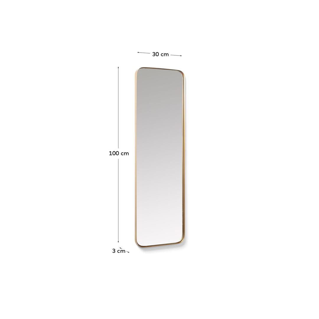 Зеркало Marcus от фабрики La Forma (ex Julia Grup) – лаконичная форма, выделенная позолоченной рамой. Зеркало Marcus – функциональный предмет интерьера, который наверняка займет свое место в вашем доме. Его особенность – это большой размер, эстетично выделенный позолоченной рамой. Скругленные углы придают форме обтекаемый вид, за счет чего большие габариты зеркала будут смотреться на стене более лаконично. Горизонтальное или вертикальное положение – только ваше решение! Зеркало состоит из стеклянной отражающей поверхности и металлической рамы, окрашенной в золотой цвет. Покрытие обеспечивает защиту от образования коррозии, увеличивает срок службы изделия. За счет порошковой технологии нанесения краски, поверхность рамы идеально гладкая. Зеркало дает естественное отражение, без эффектов. Зеркало не рекомендуется размещать в помещении с высокой влажностью, перепадом температур. Чистить его допускается специальными средствами для стеклянных поверхностей и мягкой салфеткой. Размеры: ширина – 30 см, высота – 100 см, глубина – 3 см. Вес – 4,8 кг. Подвес к стене осуществляется с помощью металлической петли, находящейся на обратной стороне изделия.