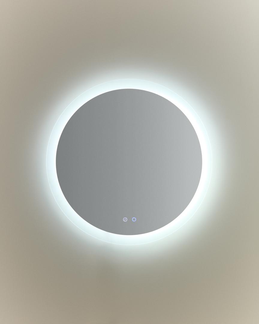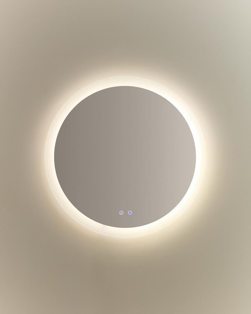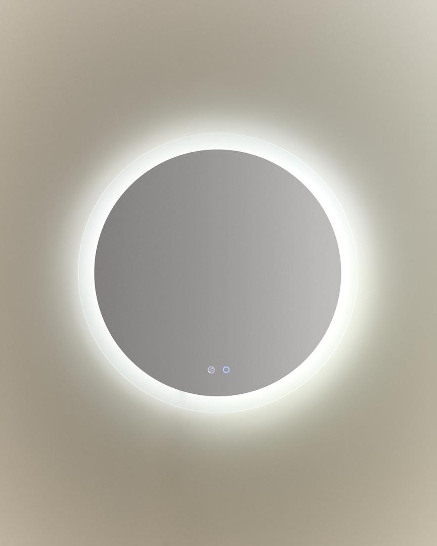 Круглое зеркало для ванной с пескоструйной обработкой стекла по периметру и функцией защиты от запотевания. По краю установлена светодиодная подсветка, регулируемая в холодном или теплом тоне. Функция защиты от запотевания и светодиодная подсветка активируются двумя сенсорными датчиками. Класс защиты IP44, подходит для использования в ванной комнате.