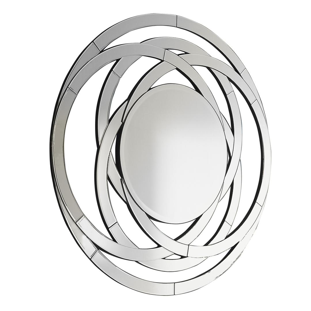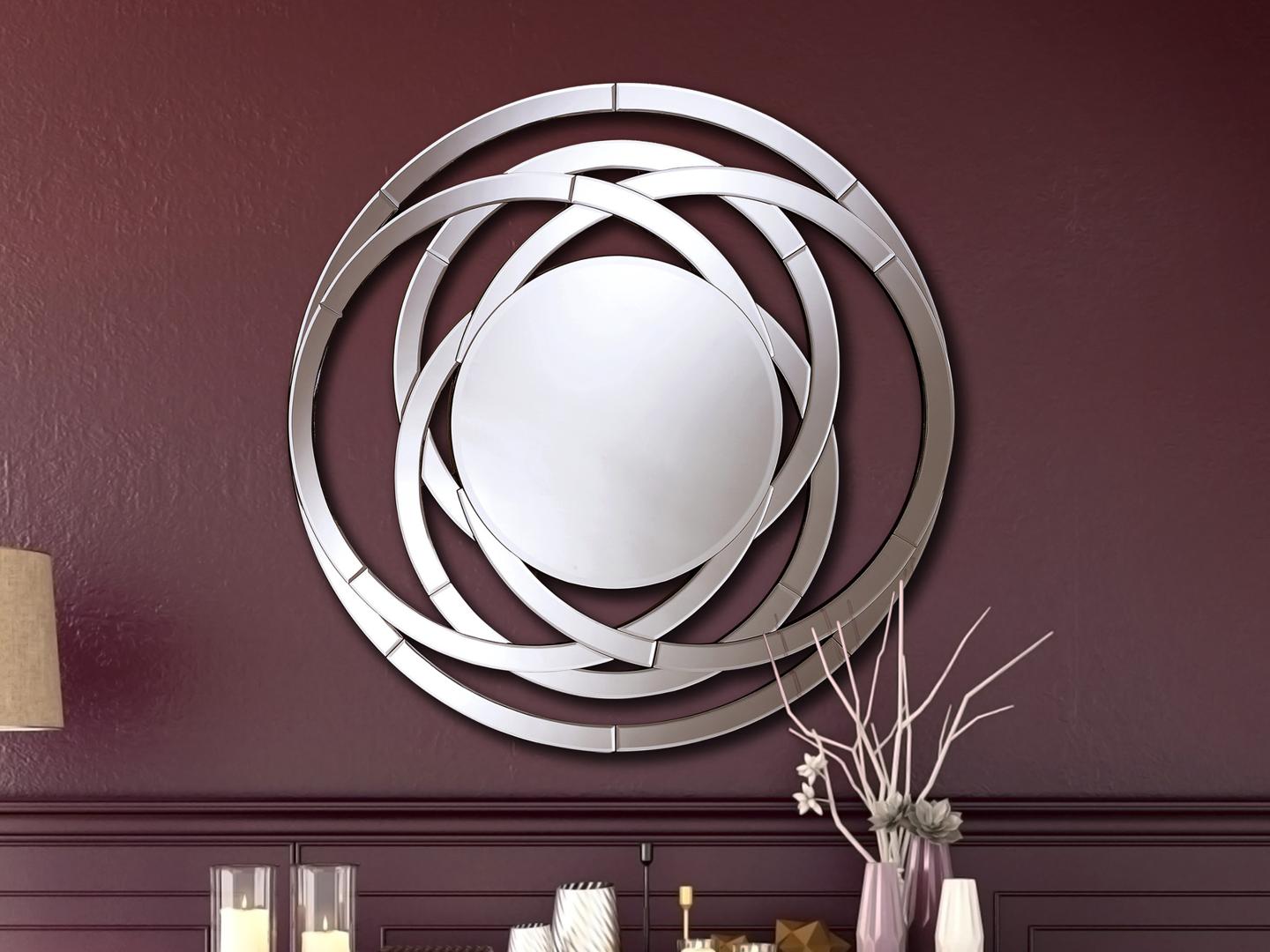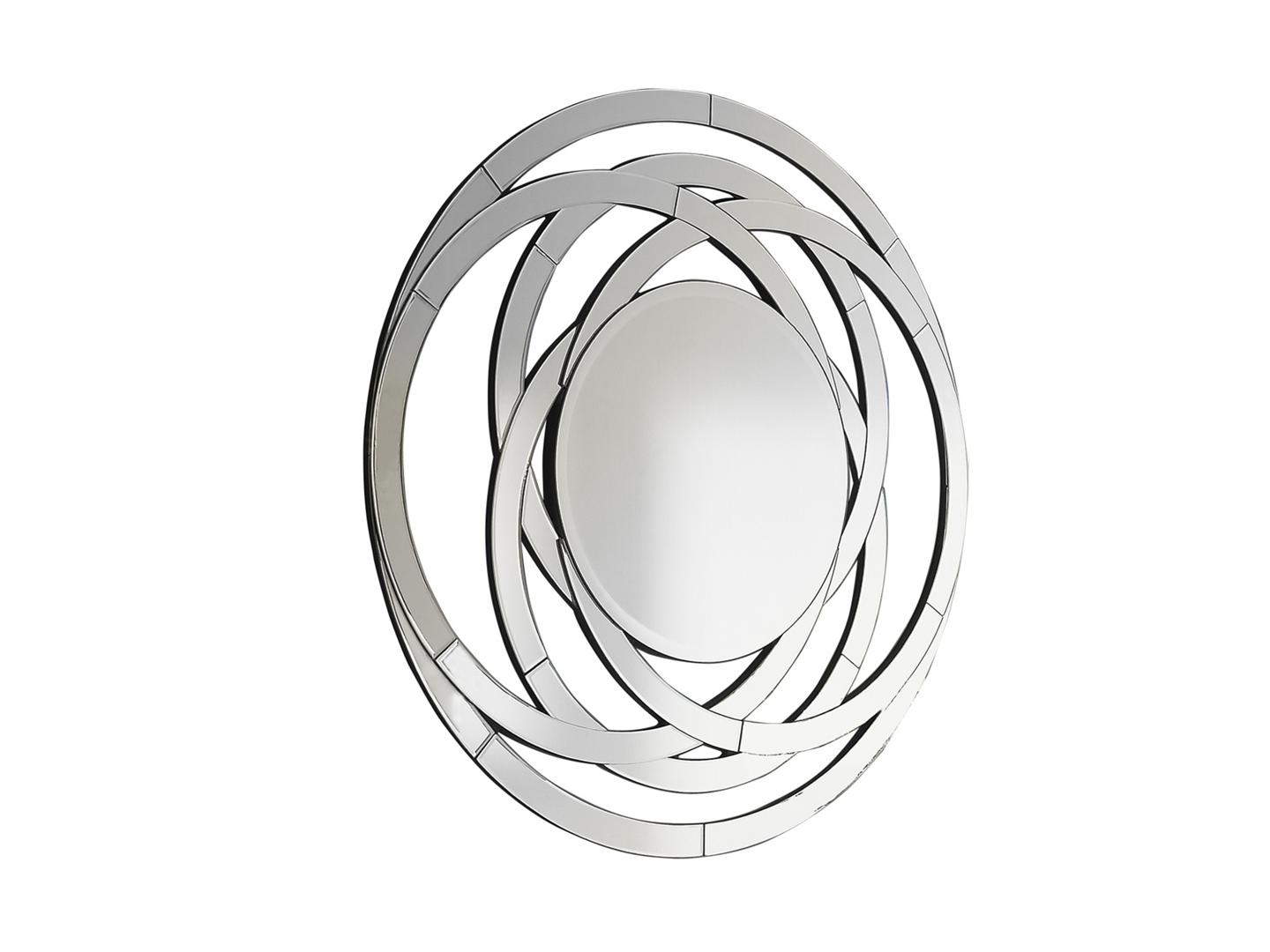 Зеркало круглое с фаской в ажурной раме в виде колец, составленных их изогнутых зеркал с фаской, на основе из дерева чёрного цвета.