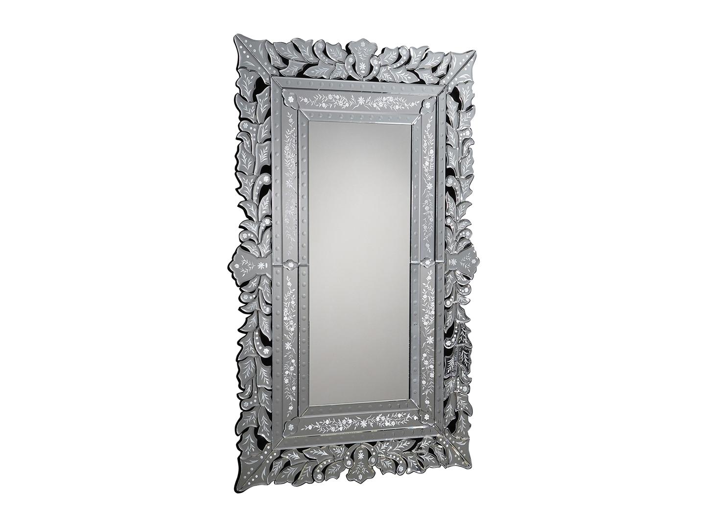 Зеркало с фаской в раме из стеклянных пластин с фаской и с узорной гравировкой, установлено на основе из дерева и MDF чёрного цвета. Подготовлено для установки в горизонтальном или вертикальном положении.