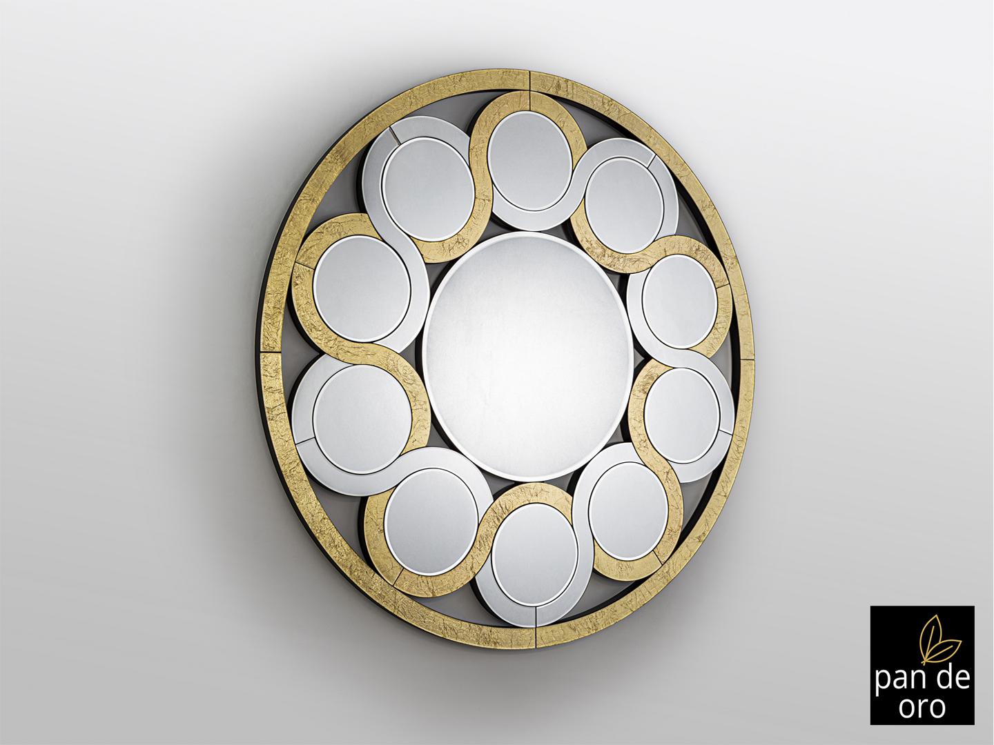 Зеркало со скошенным центральным окном. Цепочка из скошенных лун и кристаллов с обрамление в GOLDEN PAN. Задняя часть из лакированного МДФ черного цвета.