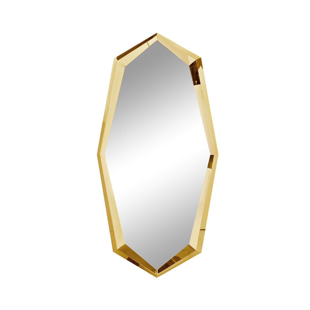 Зеркало в многогранной раме из полированной стали с высокоглянцевым покрытием золотистого цвета.