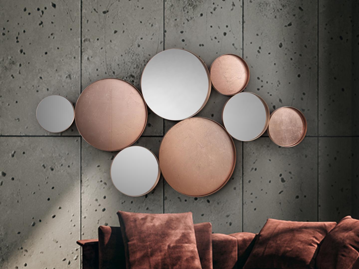 Зеркало из металлических колец, покрытых розовым золотом, с зеркальными дисками или стеклом с фоном из листьев розового золота. Можно повесить горизонтально или вертикально.
