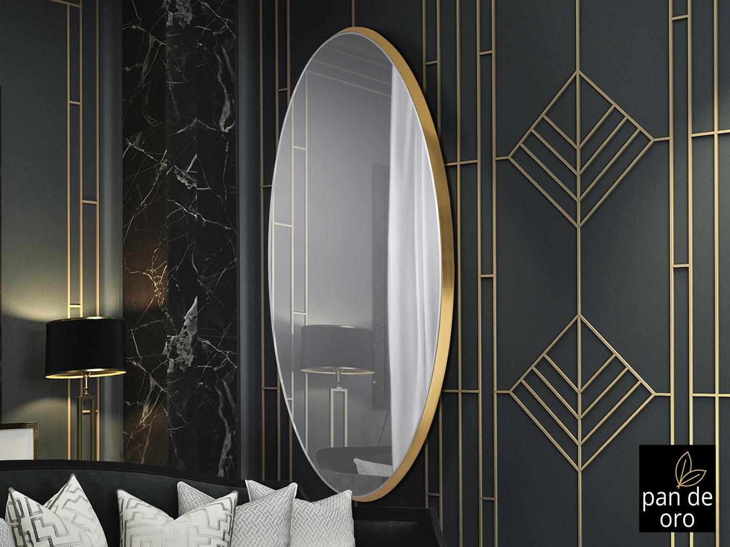 Зеркало овальное на основе толщиной 4 см в раме из MDF c покрытием из золотой фольги. Зеркальное полотно с фаской.