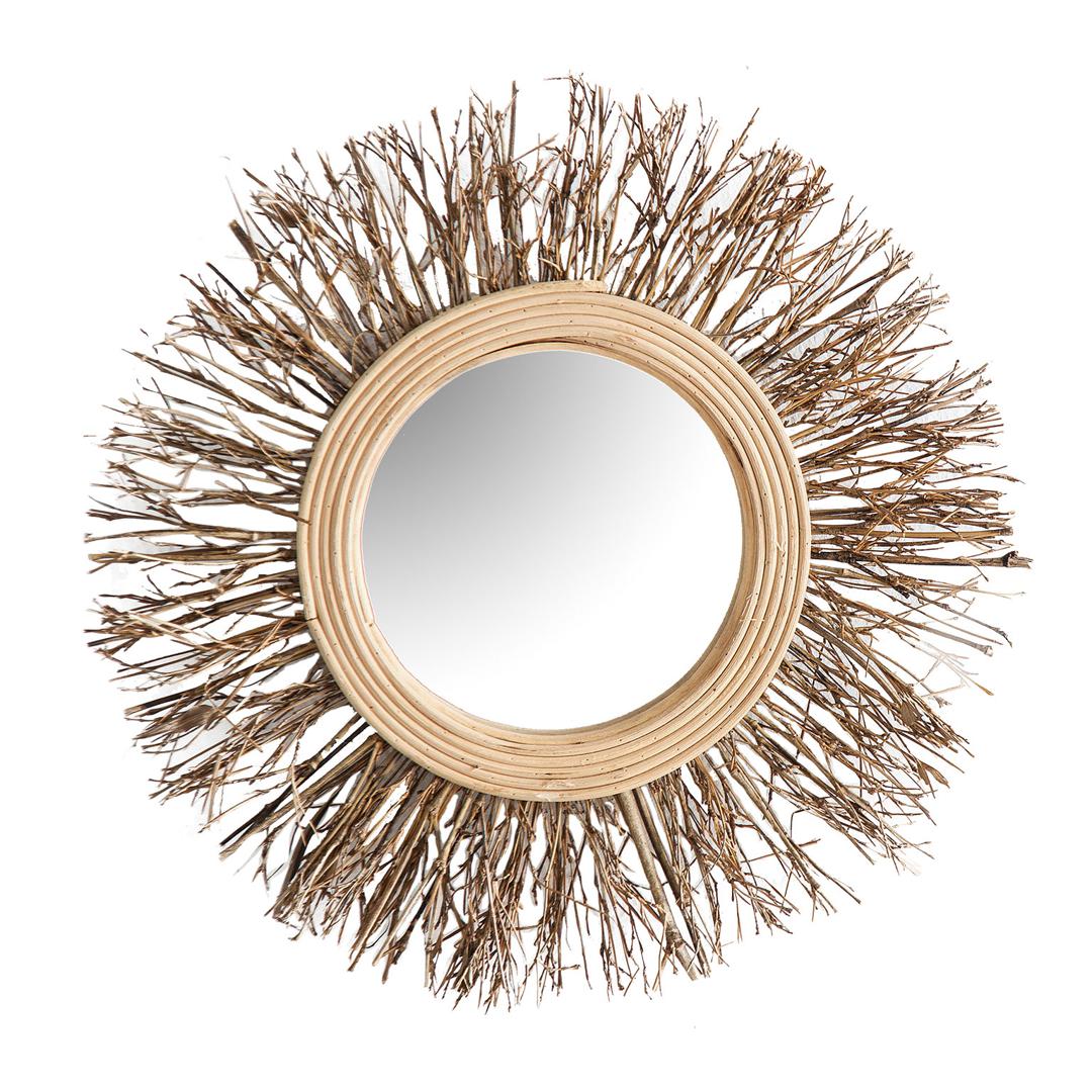 Зеркало Kail круглое, натурального цвета, в этническом стиле. Изготовлен из бамбука в сочетании с зеркалом и фанерой.