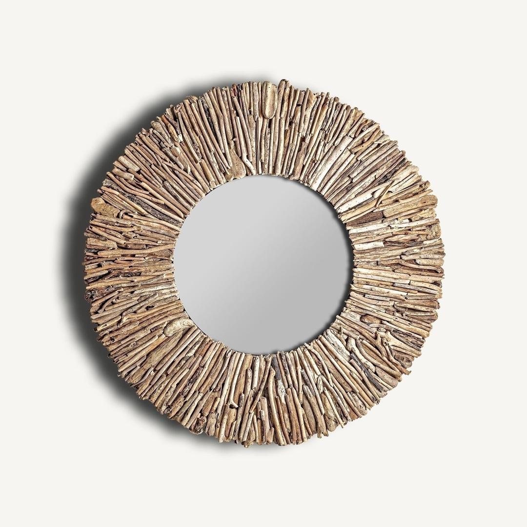 Зеркало VARVERG круглое, в состаренном натуральном цвете, в этническом стиле. Изготовлен из тропического дерева в сочетании с зеркалом. Деревянные трости.