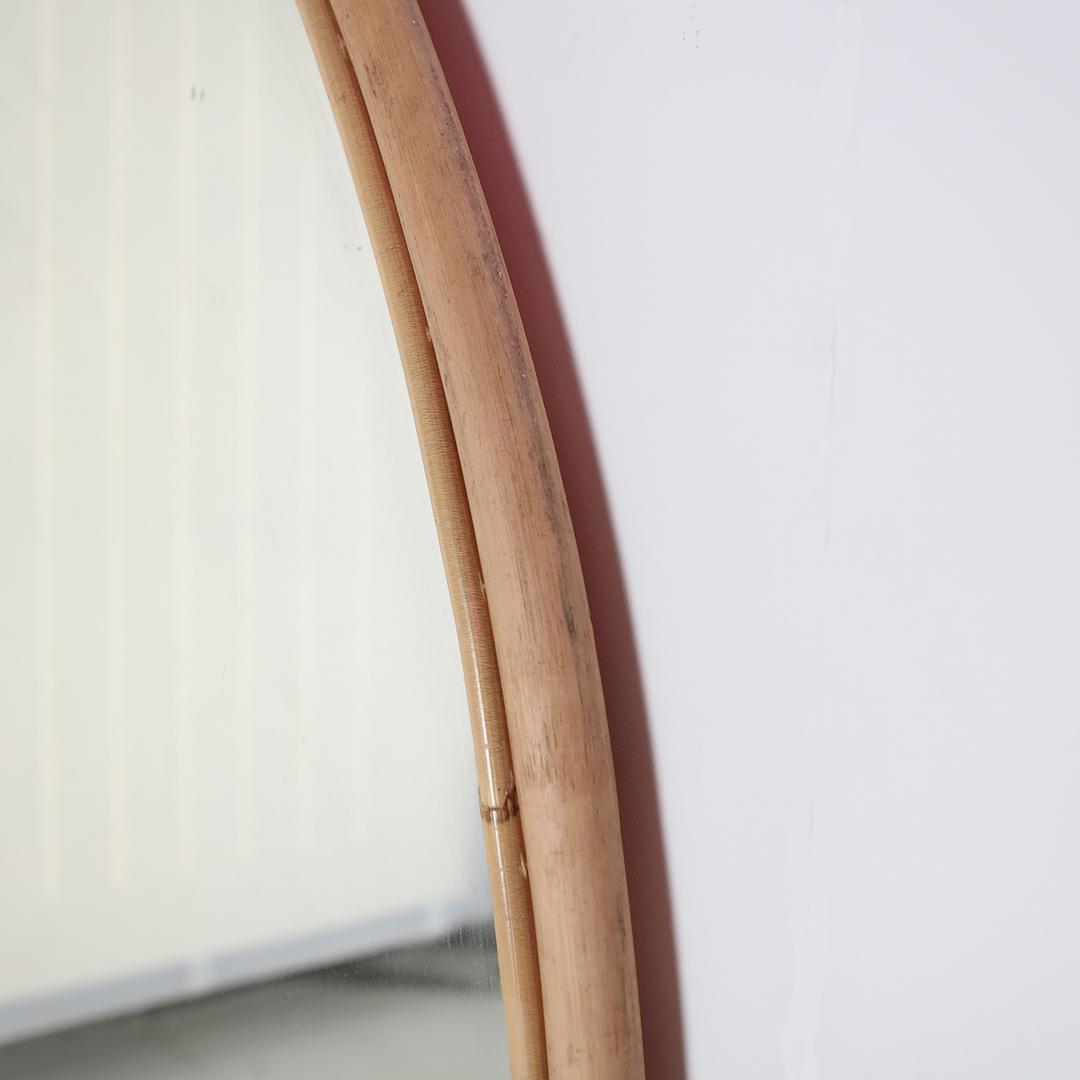 Зеркало круглой формы, натурального цвета, современный стиль. Изготовлен из бамбука, в сочетании с зеркалом. Ширина: 158 см, Глубина: 5 см, Высота: 158 см.