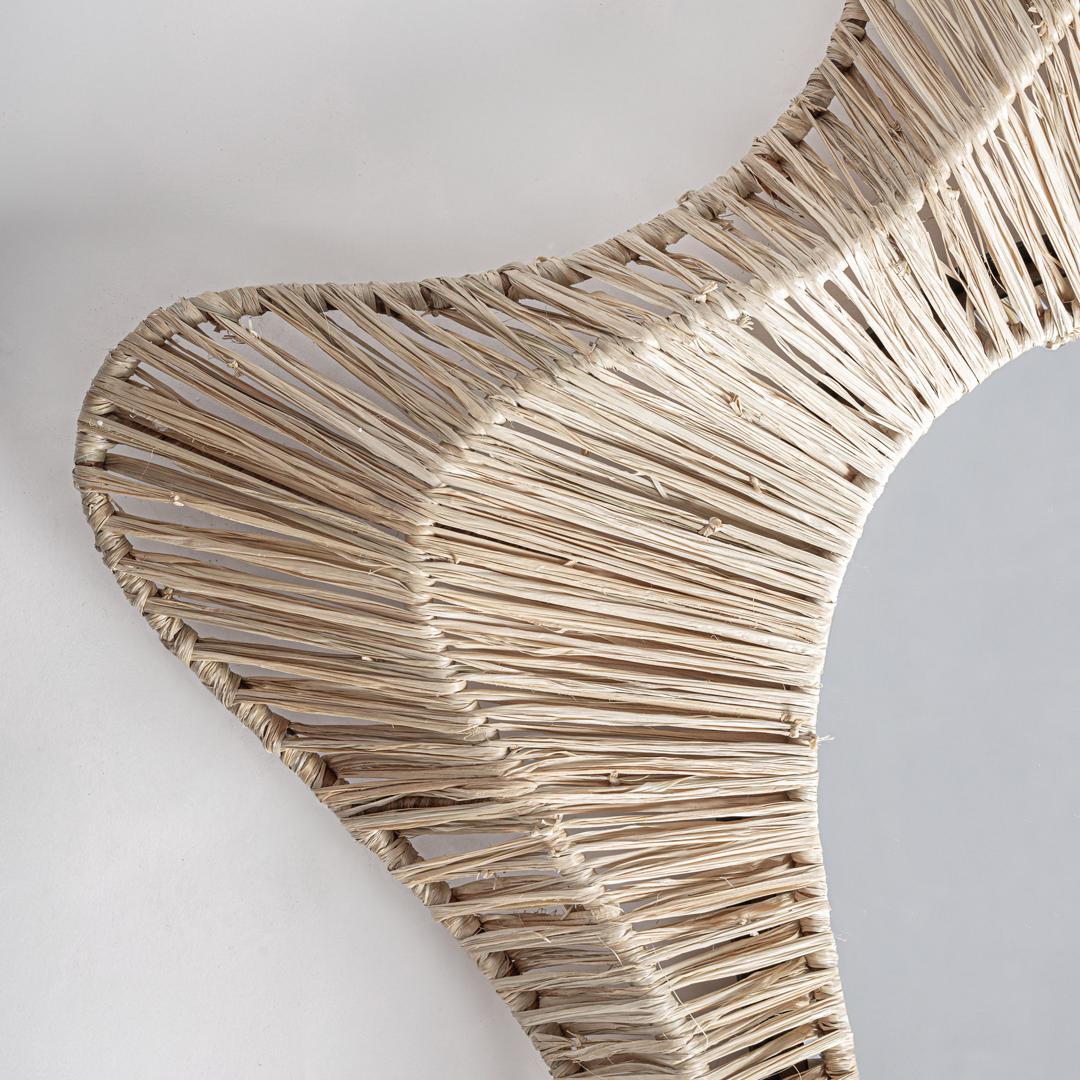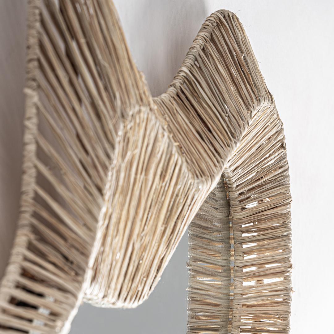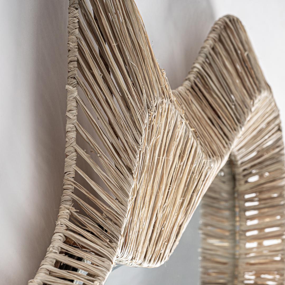 Зеркало в стиле бохо, выполненное из рафии коричневого цвета, в сочетании с зеркалом и МДФ. Ширина: 110 см, Глубина: 10 см, Высота: 150 см