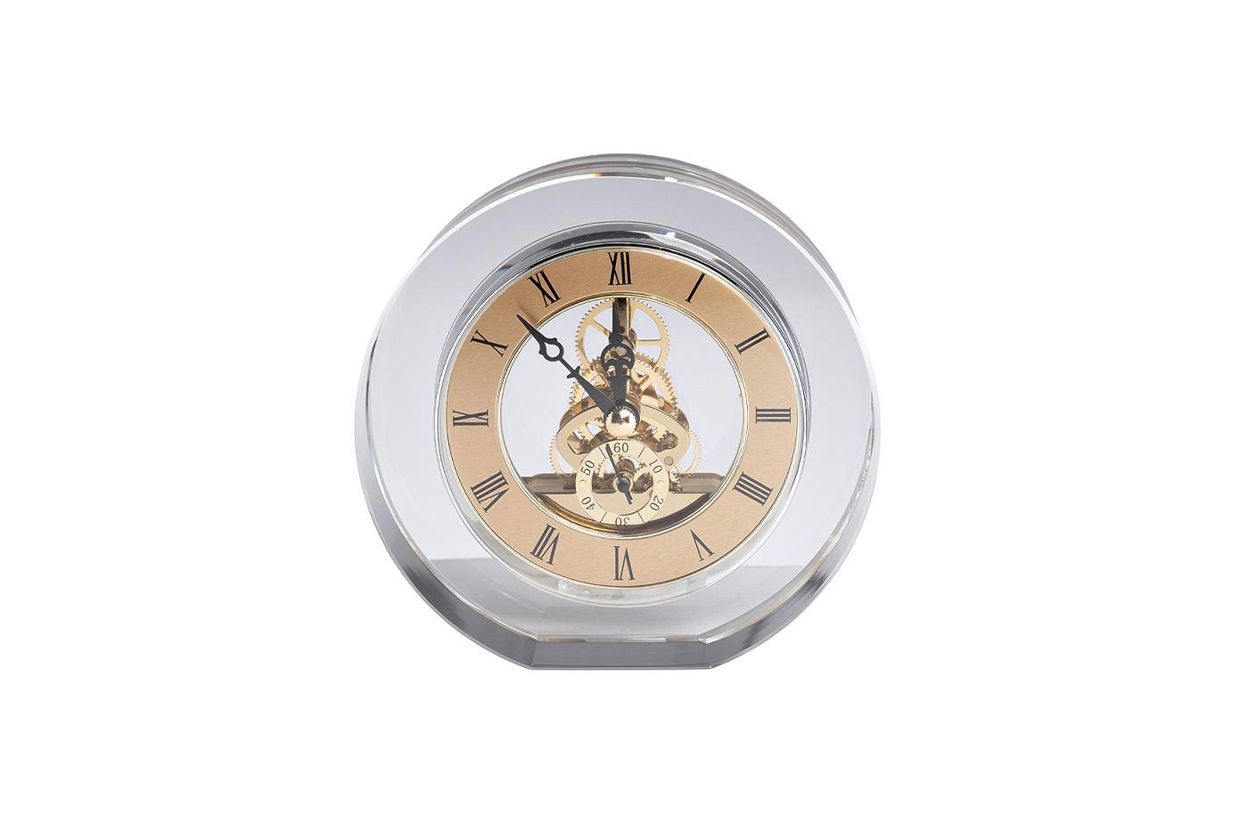 description-full - Интерьерные настольные часы из прозрачного оптического стекла станут роскошным украшением интерьера кабинета или гостиной, оформленных в стиле ар-деко. Лаконичная форма корпуса, подчеркнута классическим дизайном циферблата с римскими цифрами. Часовой механизм с открытым балансом завораживает плавностью движения, превращая часы в настоящее произведение искусства. Блеск полированного металла и игра света на стеклянных гранях притягивают взгляд, а тихий ход стрелок создает атмосферу спокойствия и умиротворения.