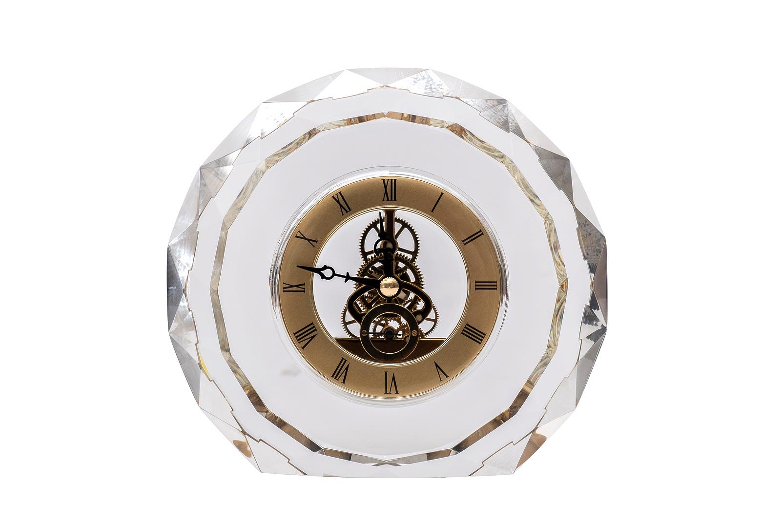 description-full - Интерьерные настольные часы из прозрачного оптического стекла станут роскошным украшением интерьера кабинета или гостиной, оформленных в стиле ар-деко. Лаконичная форма корпуса, подчеркнута классическим дизайном циферблата с римскими цифрами. Часовой механизм с открытым балансом завораживает плавностью движения, превращая часы в настоящее произведение искусства. Блеск полированного металла и игра света на стеклянных гранях притягивают взгляд, а тихий ход стрелок создает атмосферу спокойствия и умиротворения.