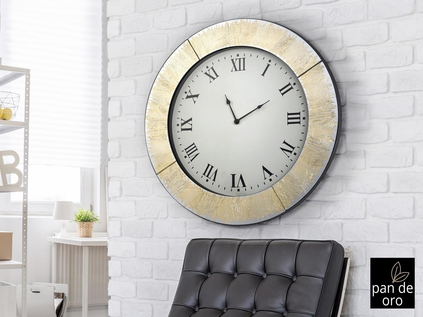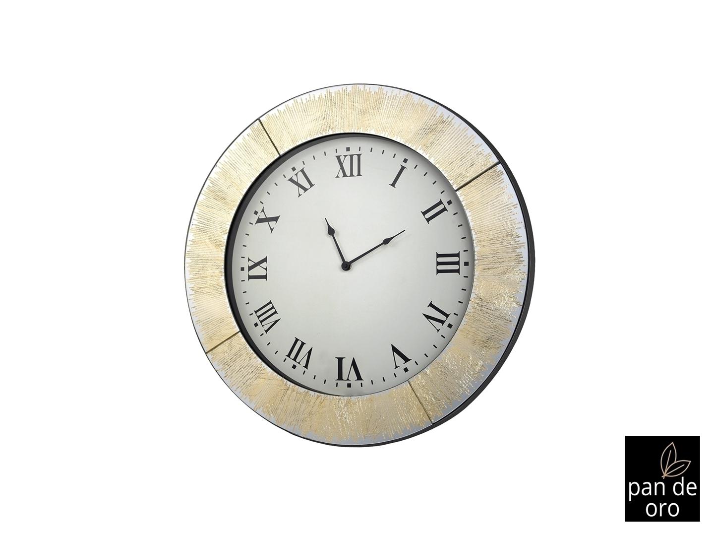 Часы круглые в раме из зеркального стекла с графическим узором из золотой фольги, напечатанный циферблат. На основе из MDF, покрытой чёрным лаком.