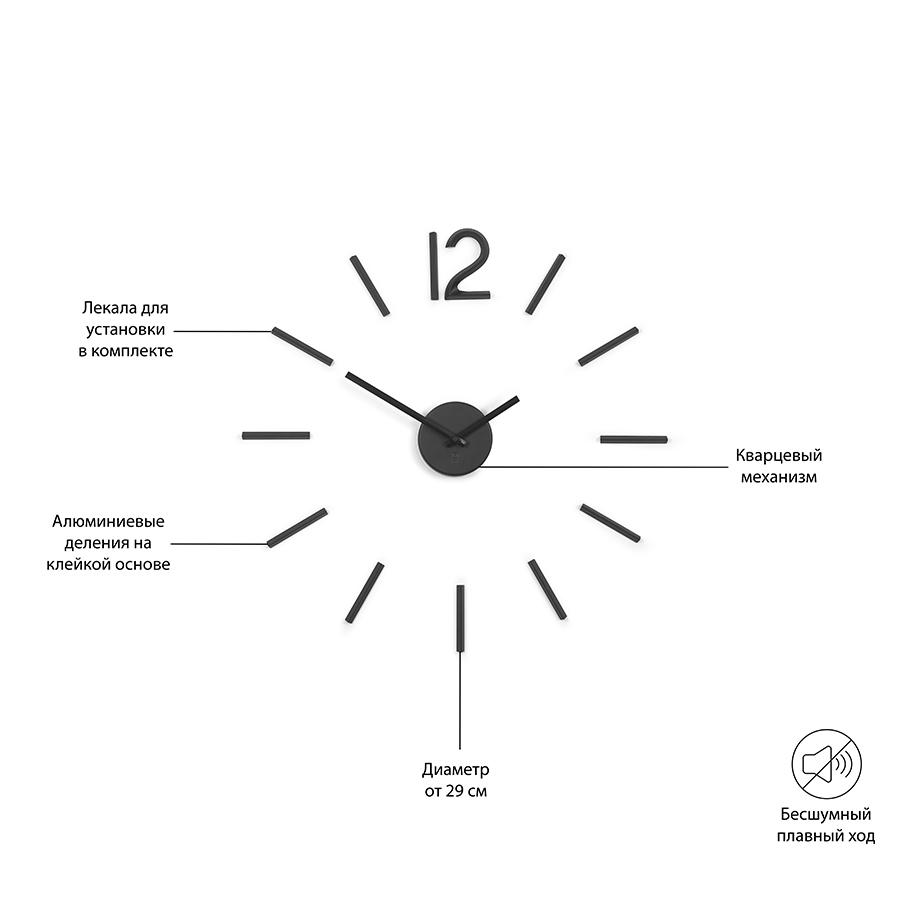 На создание этих часов дизайнеров вдохновила современная архитектура и минималистичные циферблаты модных наручных часов. Они необычны тем, что индикаторы и сам механизм крепятся к стене отдельно друг от друга: индикаторы на специальную липучку 3M Command, а механизм – на шурупы. Это дает простор для фантазии, так как часы могут быть любого диаметра. Шаблон для крепления часов входит в комплект. Индикаторы, цифра "12" и механизм со стрелками выполнены из литого алюминия. Ход часов плавный и совершенно бесшумный. Работают часы от одной стандартной батарейки типа АА (не входит в комплект). Материал: алюминий, сталь. Размеры: 100х4х100 см. Цвет: черный. Пыль и загрязнения удалять при помощи мягкой влажной салфетки. Запрещается использование агрессивной бытовой химии и абразивных материалов.
