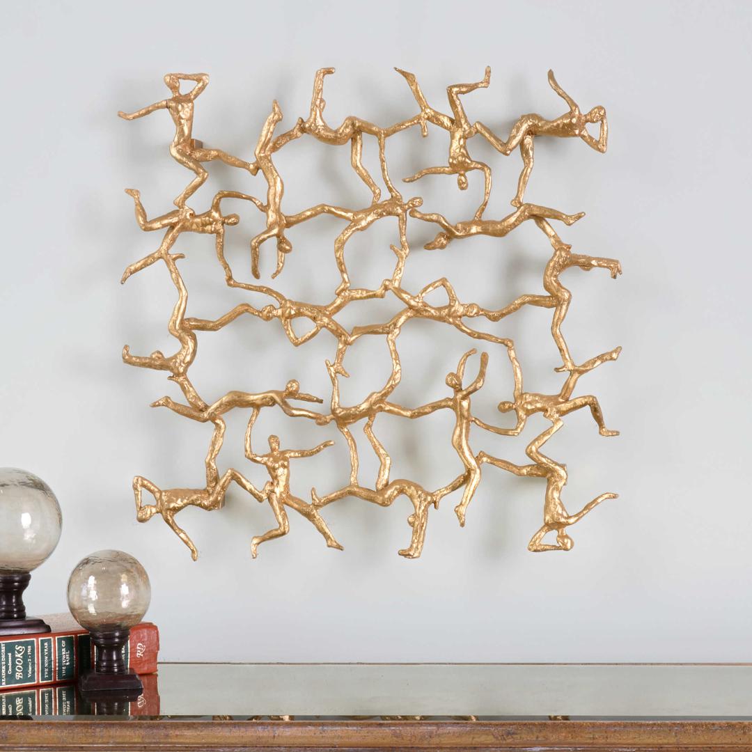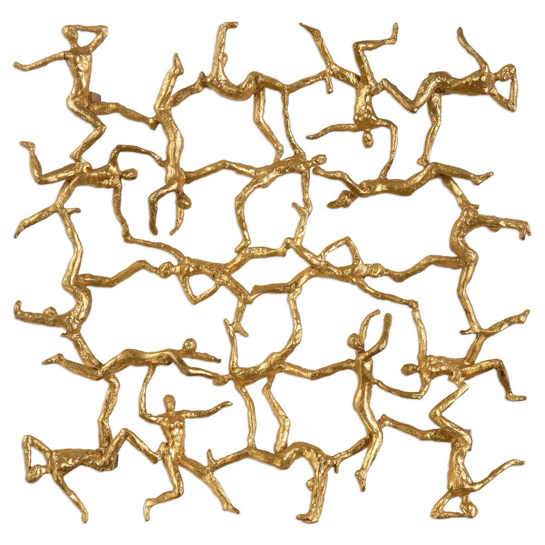 Весьма интересный вариант настенного декора, который придется по вкусу многим. Изготовлен декор из металла в золотой отделке и представляет из себя причудливую композицию из маленьких фигурок гимнастов. Такой декор сумеет не только вписаться практически в любой интерьер, но и привнесет в него нотки особого стиля и некую изюминку. Отлично подойдет в качестве подарка.