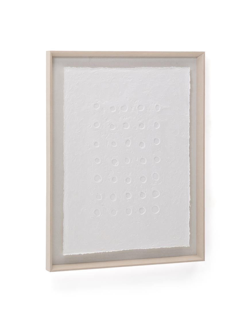 Картина Olvin выполнена из белой переработанной бумаги с уникальными рельефными узорами ручной работы, которые отличаются своим аутентичным характером. Каждый элемент является результатом техники тиснения, которая создаёт узор из точек и кругов по центру, добавляя дизайну текстуру и объём. Благодаря чистому покрытию картина идеально подходит для придания любому пространству художественного и оригинального вида. Она также прекрасно сочетается с другими картинами из коллекции, позволяя создавать гармоничные визуальные композиции, полные характера. Каждый рельеф отражает преданность своему создателю, что делает эту работу декоративным аксессуаром, сочетающим экологичность и современный дизайн.