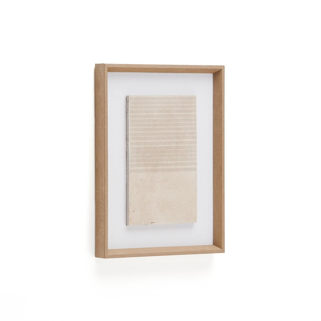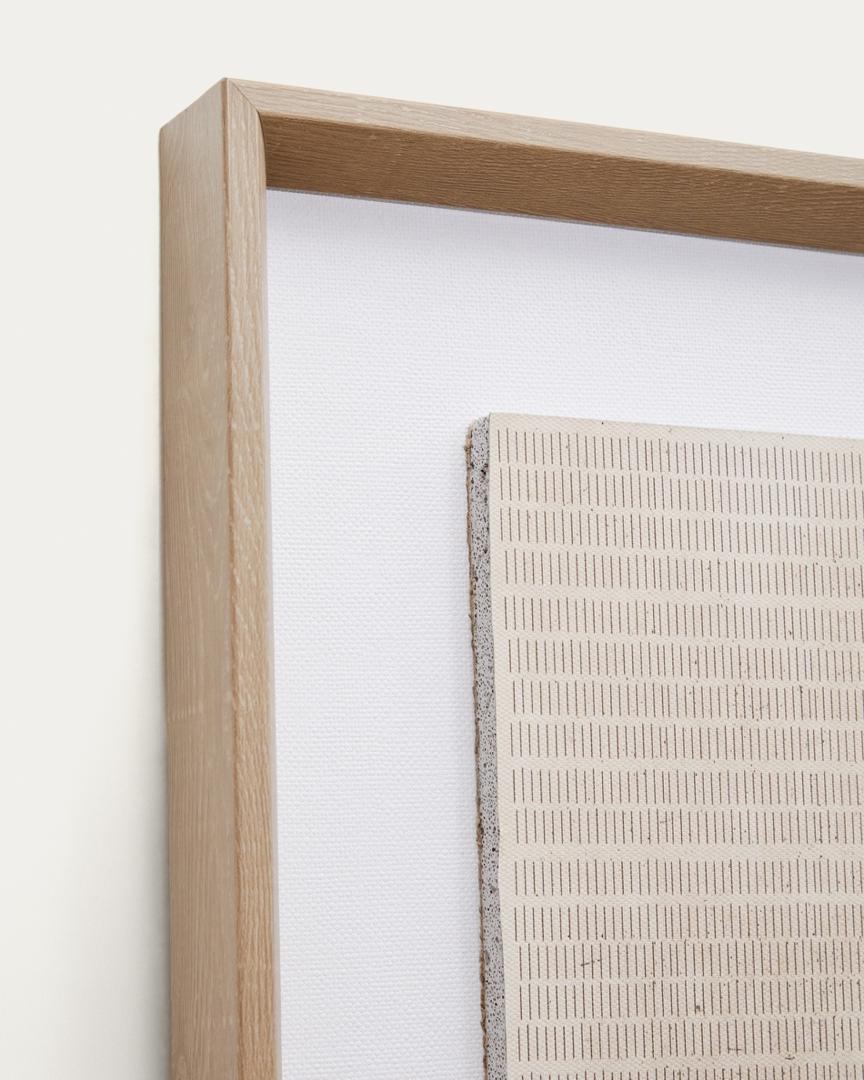 Картина Sormina от фабрики La Forma (ex Julia Grup) - оригинальная тканевая абстракция для выделения пространства. Картина Sormina — фактурное панно, которое добавит индивидуальность вашей комнате. Оригинальная аппликация из полосок льна с эффектом паспарту смотрится необычно и стильно. А нейтральный фон и деревянная рама адаптируются под любой цвет стены. Поэтому выделите свое пространство так, как не будет ни у кого. Картина — это не обязательно краски. Картина имеет прямоугольную форму. Она состоит и деревянной рамы с отделкой из орехового МДФ, белой задней стенки и центральной панели в холщовой обивке. Холст бежевого цвета. На нем размещена аппликация и льняных полос в натуральной отделке. Центральная панель открыта, поэтому требует деликатной чистки и эксплуатации в помещении с нормальным уровнем влажности и температуры. Для картины не рекомендуется выбирать стену с постоянным воздействием прямых солнечных лучей, Размеры: ширина – 30 см, высота – 40 см, глубина – 3,8 см. Вес — 0,86 кг. Для подвеса на задней стенке предусмотрена петля.