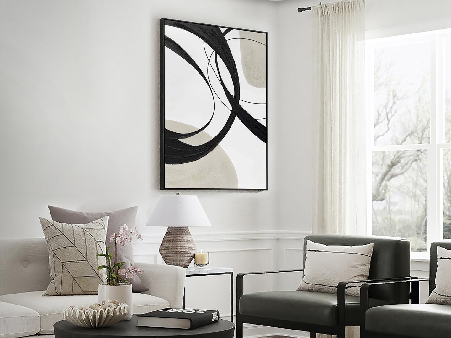 Картина выполнена акрилом, натянута на подрамник. Рама из черного полистирола. Готова повесить в горизонтальном или вертикальном положении.
