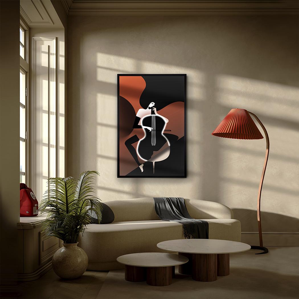 Абстрактная дама с виолончелью, композиция с декоративной светодиодной полосой. Напечатанный холст, наклеенный на доску и оформленный в черную раму. Соединительная коробка на задней стороне полотна. Вилка в комплект не входит.