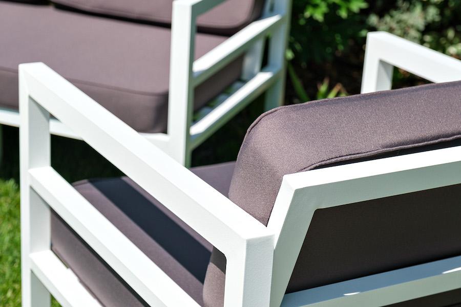 Лаунж-зона «Эстелья» в стиле минимализм для обустройства открытых и закрытых зон отдыха. Рассчитана на 4 персоны. В комплект входят: - журнальный столик из алюминиевого каркаса и столешницы HPL. Размер - 900×600×420 мм. - двухместный диван - 1480×760×730 мм. - два кресла - 780×760×730 мм. Каркас дивана и кресел выполнен из прочного алюминия и окрашен в белый цвет. Комплект дополняют подушки со съёмными чехлами и водоотталкивающей пропиткой. Материал чехлов - 100% полиэстер плотностью 3 "Эстелья" диван двухместный, алюминиевый каркас 1шт. 1 480Х760Х730, "Эстелья" кресло интерьерное, каркас из алюминия, АЛ-К-0001 2шт. 780Х730Х650, "Глория" журнальный стол 90х60см из HPL, цвет "молочный" 1шт. 900Х600Х420,