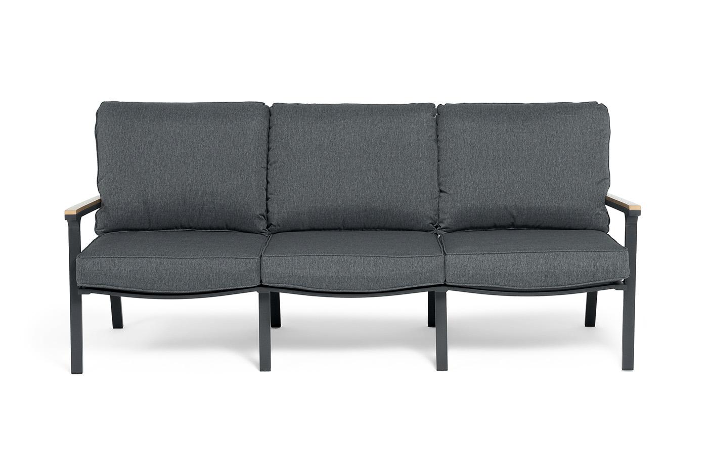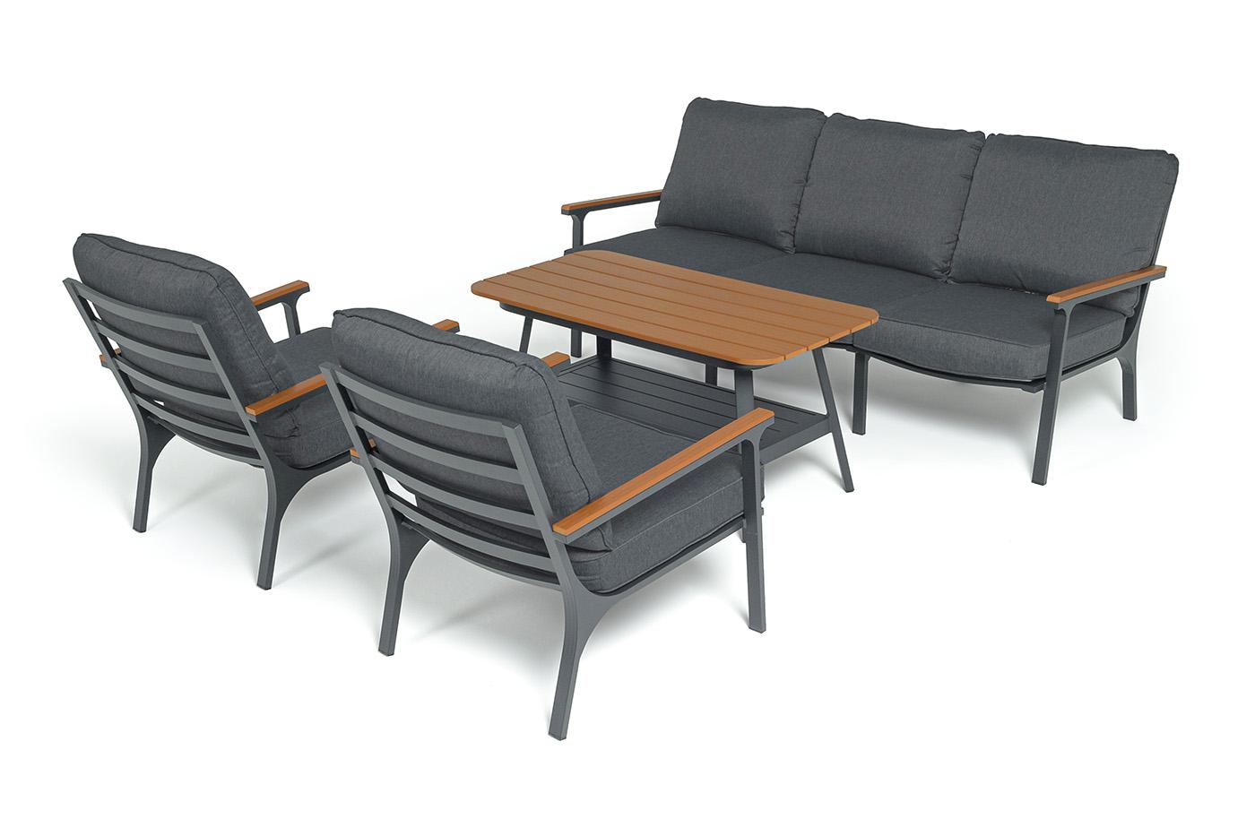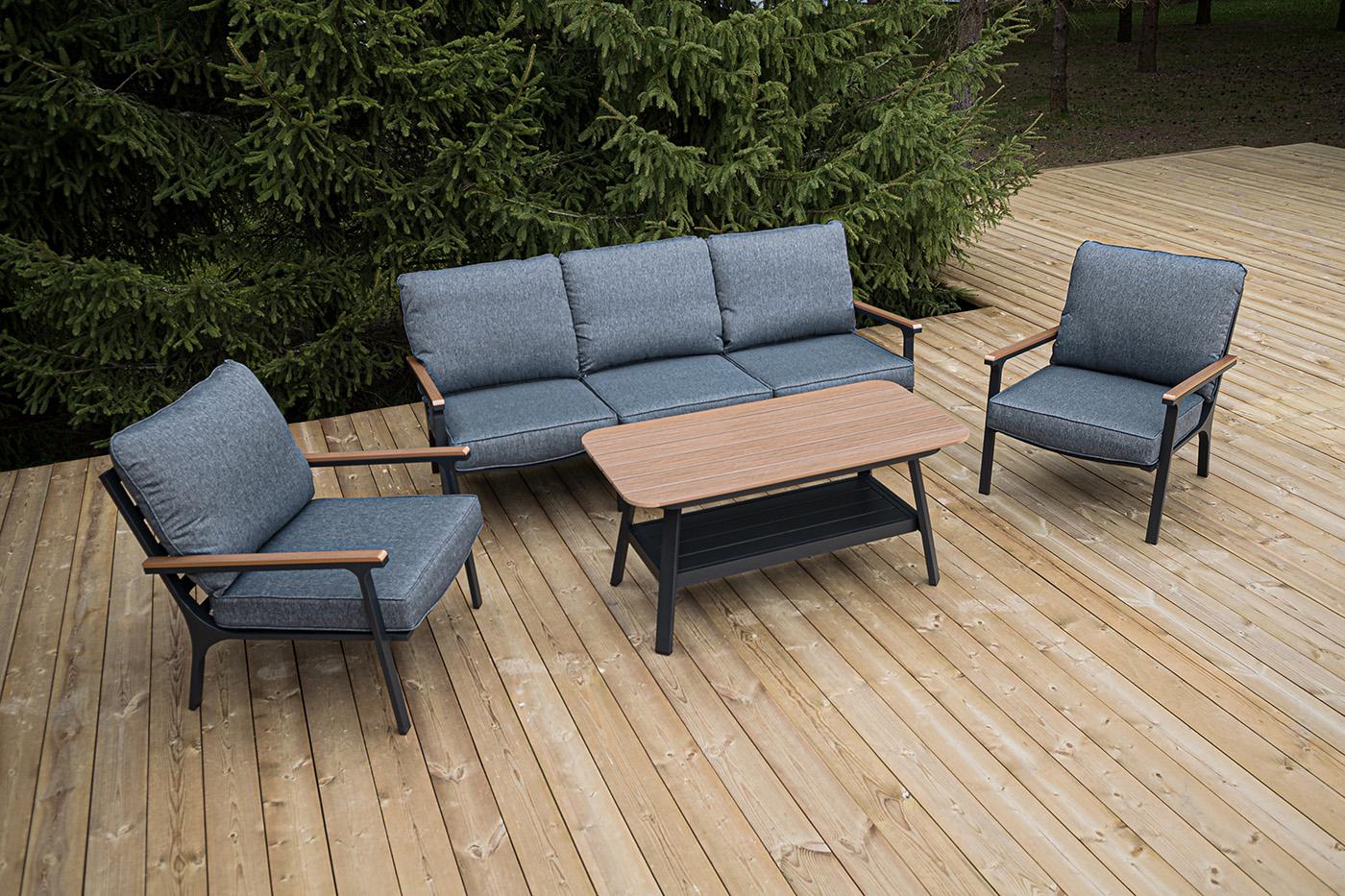 Лаунж-зона «Крокус» для обустройства открытых и закрытых зон отдыха. Рассчитана на 4 персоны. В комплект входят: - журнальный столик - 1200×600×560 мм. - трехместный диван - 1990×800×780 мм. - два кресла - 720×840×780 мм. Каркас мебели выполнен из прочного алюминия темно-серого цвета. На подлокотниках дивана и двух кресел установлен облицовочный материал из древесно полимерного композита (ДПК) цвет «дерево». Крепление к каркасу осуществляется на болтах с пластиковыми заглушками темно-серого цвета, которые не ржавеют. Комплект дополняют подушки со съёмными чехлами. Материал чехлов - 100% полиэстер плотностью 190гр/м2. Данная модель продается только комплектом и доставляется в разобранном виде!