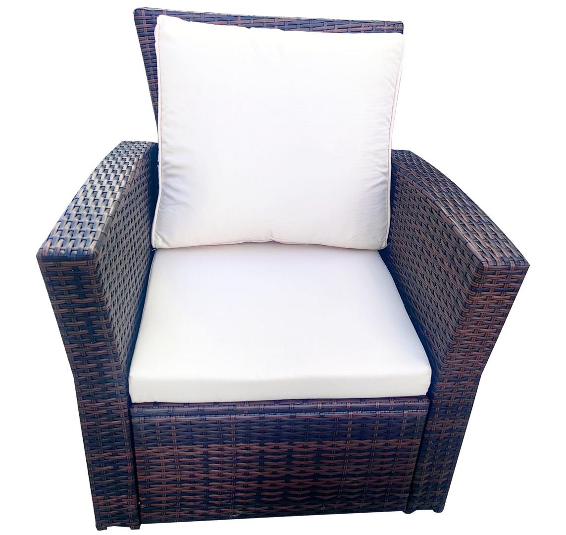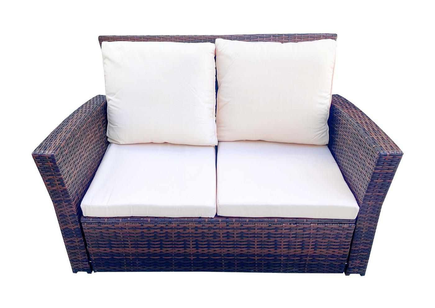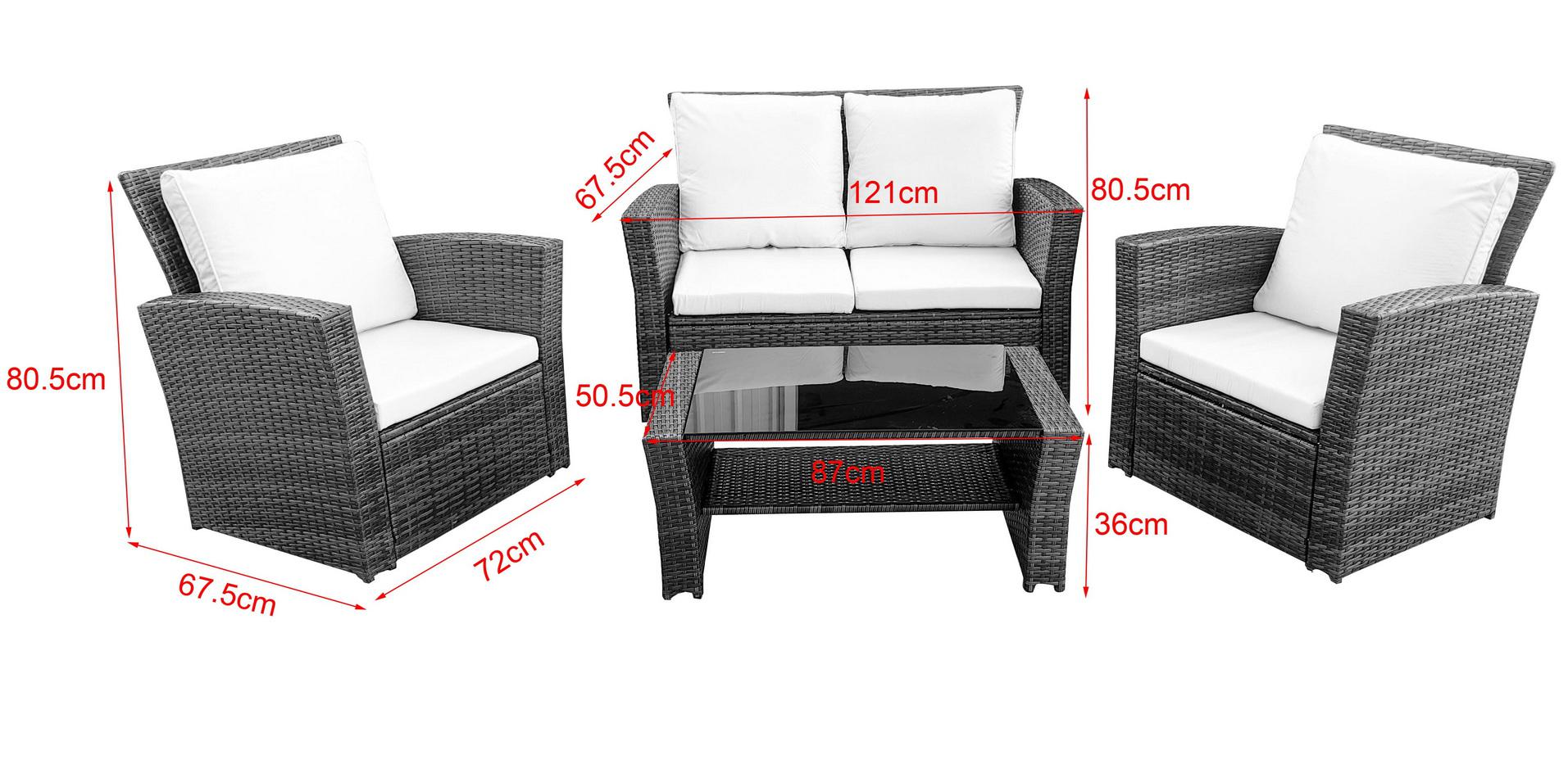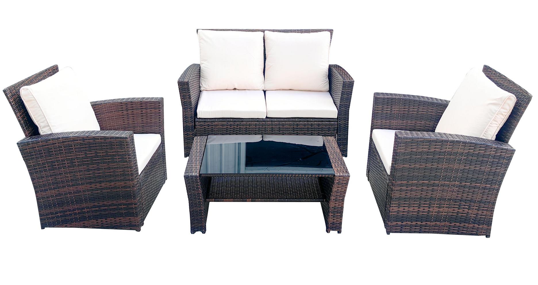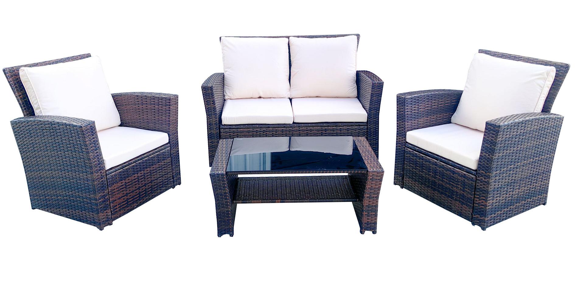 Лаунж-зона «» компактный комплект, рассчитанный на 4 персоны. В ее состав входят: - двухместный диван – 1210×675×805 мм. - два плетеных кресла – 720×675×805 мм. - журнальный столик – 870×505×360 мм. В основе мебели - стальной каркас и плоский искусственный ротанг. Каркас оплетен с помощью ручного метода и представлен в коричневом цвете. Диван и кресла укомплектованы подушками со съёмными чехлами из полиэстера, плотностью 200гр/м2. Журнальный столик дополняет рабочая поверхность из прочного з