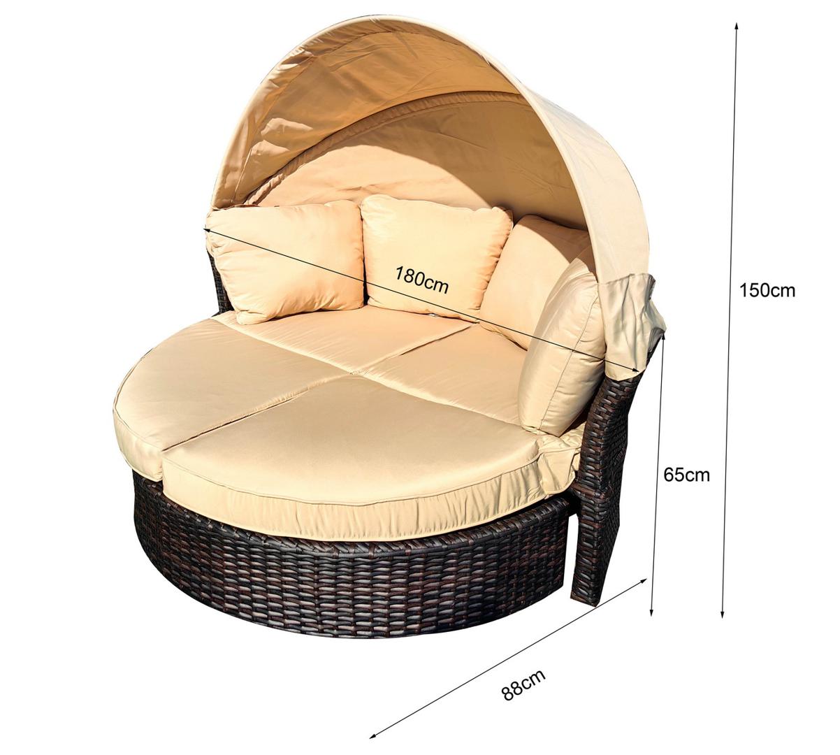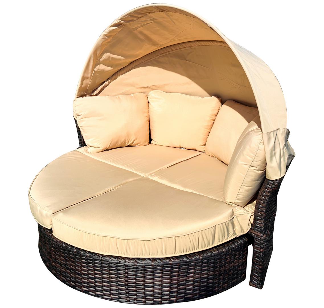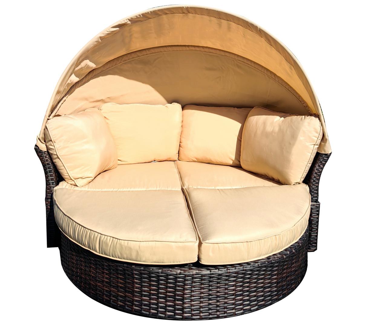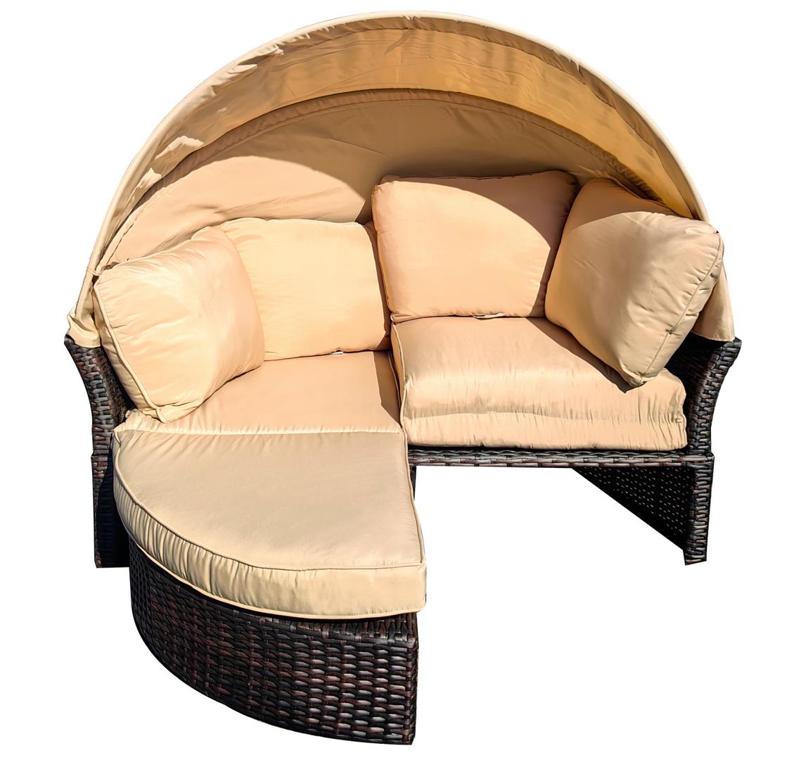 Трансформирующаяся кровать «Амальфи» из искусственного ротанга — идеальное решение для зоны отдыха на открытом воздухе, в том числе у бассейна. Конструкция отличается надёжностью: в основе — прочный стальной каркас, вручную оплетённый плоским искусственным ротангом. Для комфорта предусмотрена защитная функция — козырёк из 100% полиэстера, который ограничивает попадание прямых солнечных лучей. Без лишних усилий круглая кровать становится компактным диваном — достаточно задвинуть переднюю часть