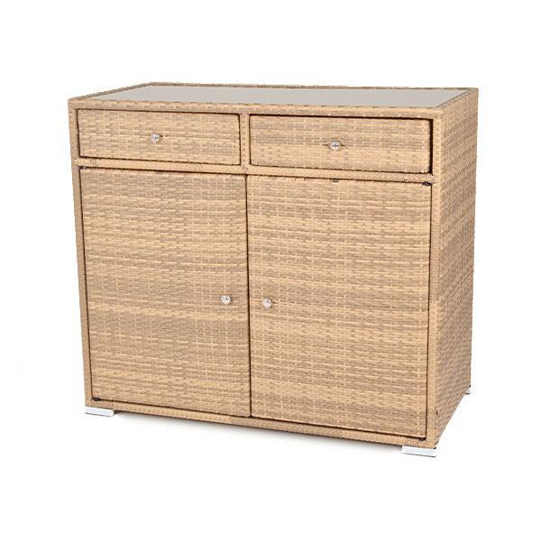 «Мальта» тумба изготовлена из алюминиевого каркаса, оплетенного плоским искусственным ротангом соломенного цвета. Размер - 1160×560×1020 мм. Тумба оснащена двумя выдвижными ящиками и двумя полками внутри. Закрывается на распашные дверцы.