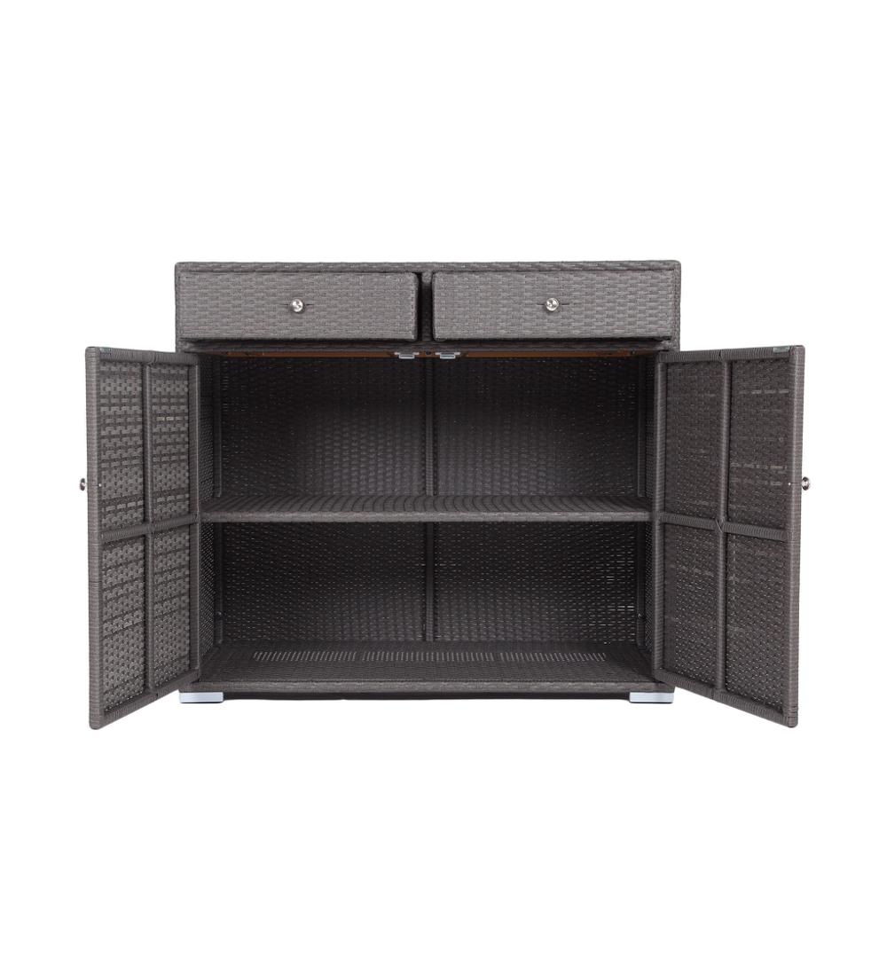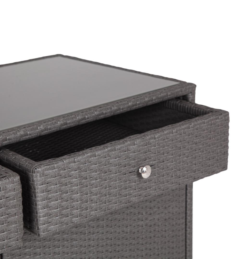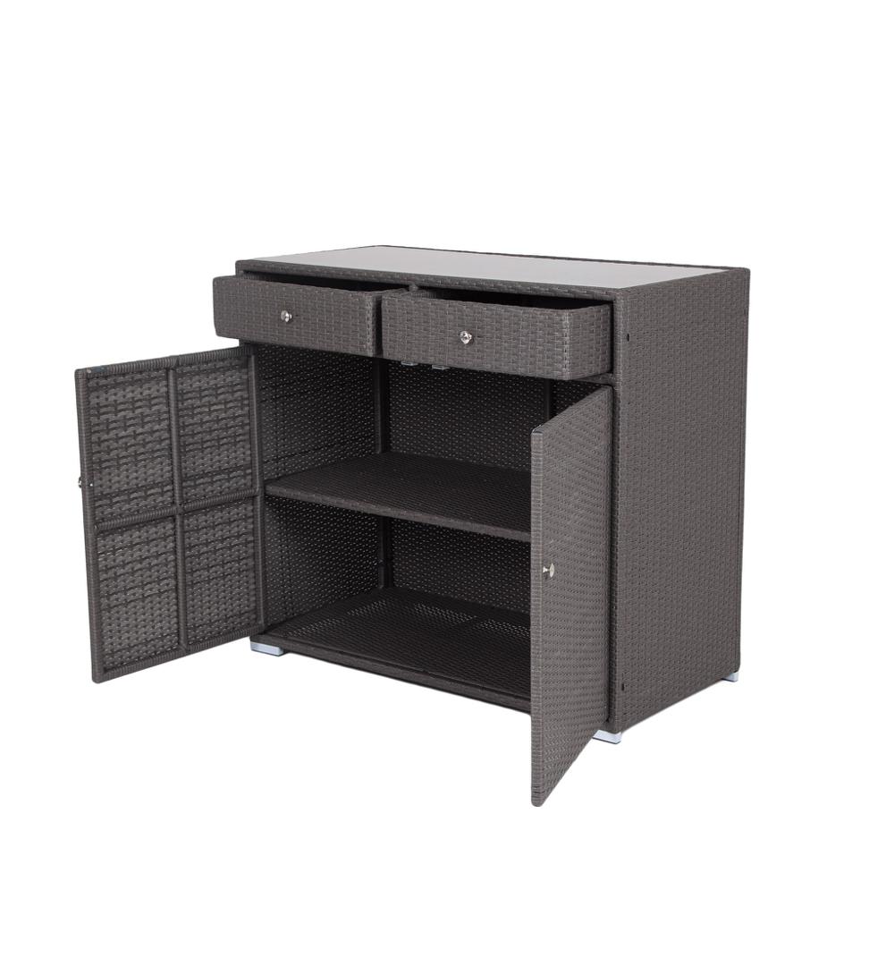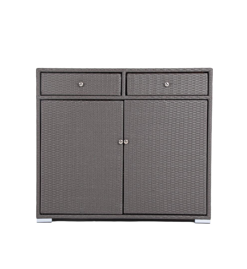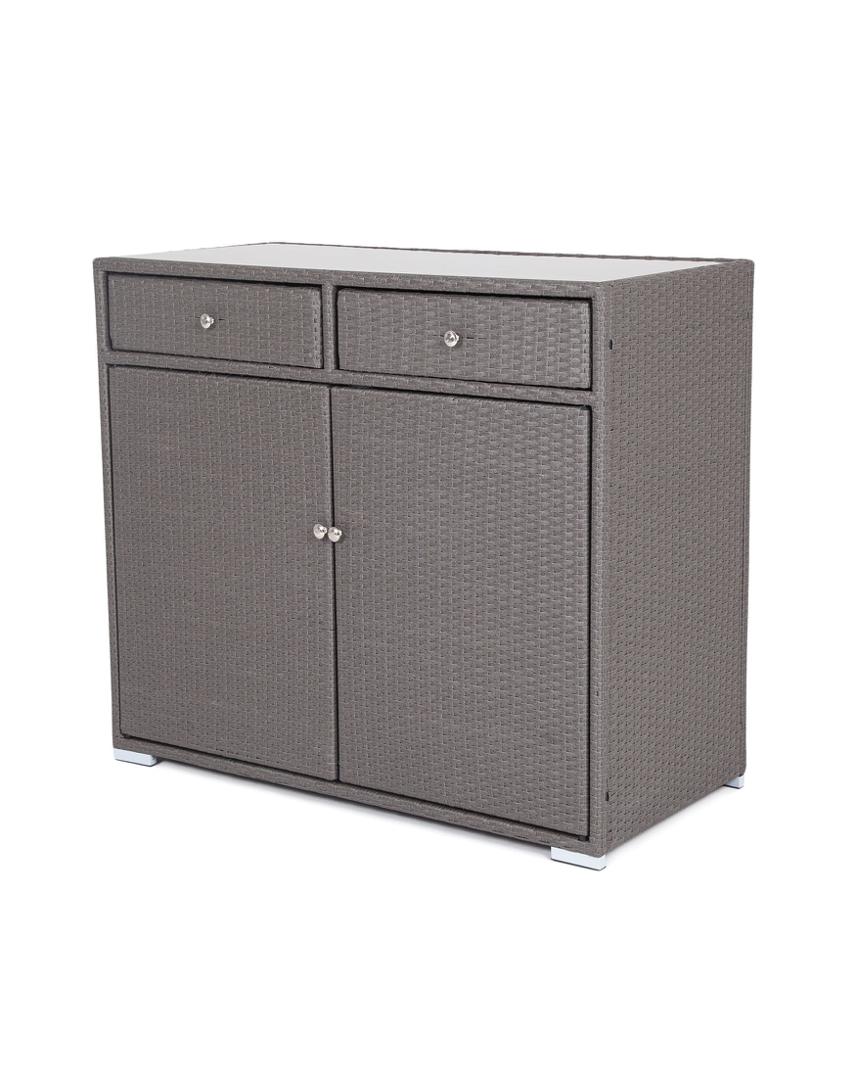 «Мальта» тумба изготовлена из алюминиевого каркаса, оплетенного плоским искусственным ротангом графитового цвета. Размер - 1160×560×1020 мм. Тумба оснащена двумя выдвижными ящиками и двумя полками внутри. Закрывается на распашные дверцы.