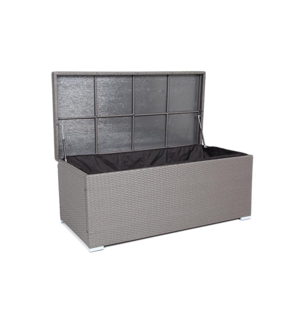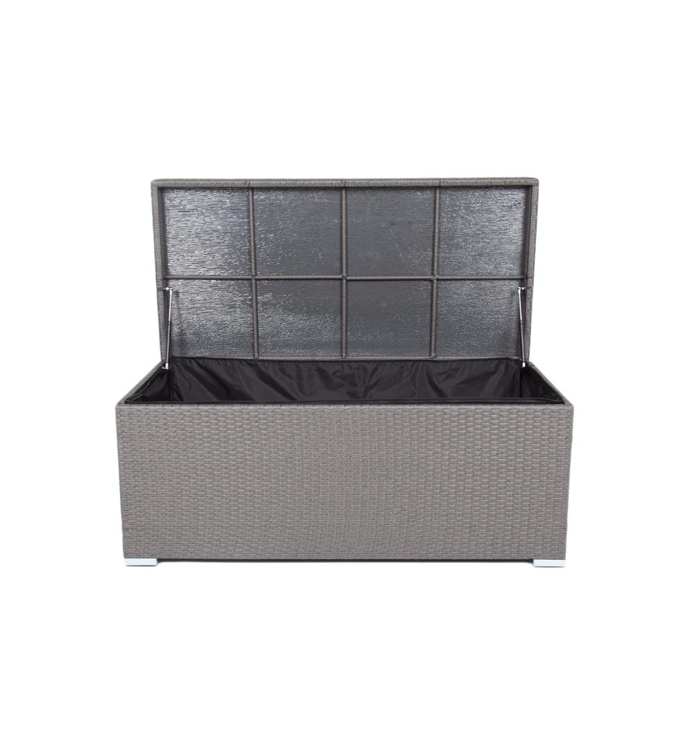 «Порту» вместительный сундук из плоского искусственного ротанга в цвете "графит". В основе - алюминиевый каркас. Размер: 1400×700×600 мм. Сундук предназначен для хранения текстильных изделий, водонепроницаем, поэтому можно использовать на улице, не боясь осадков.