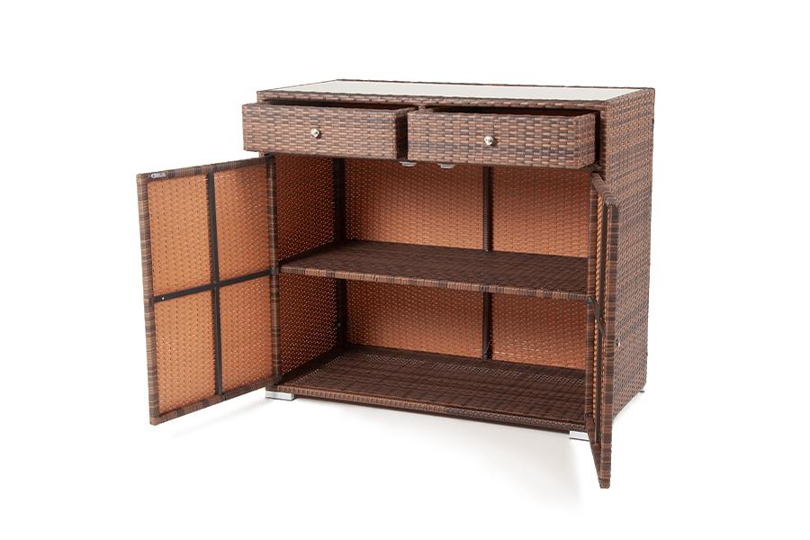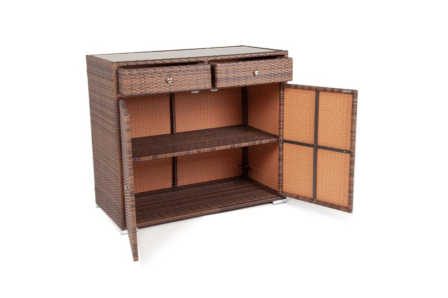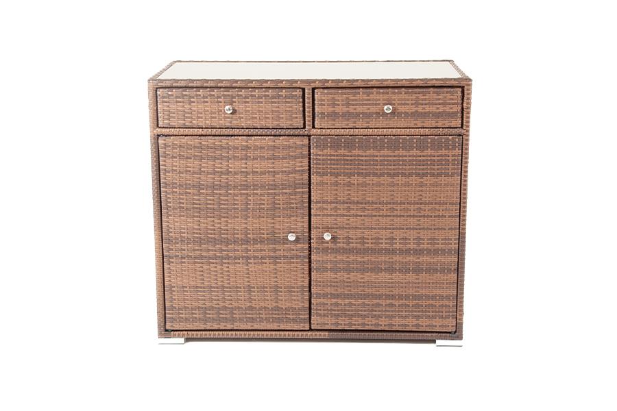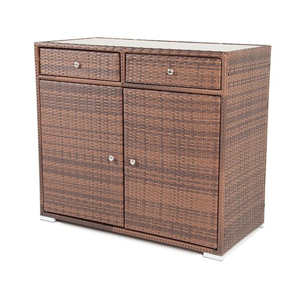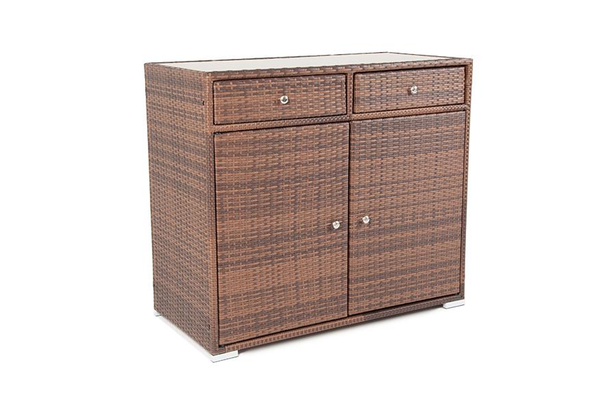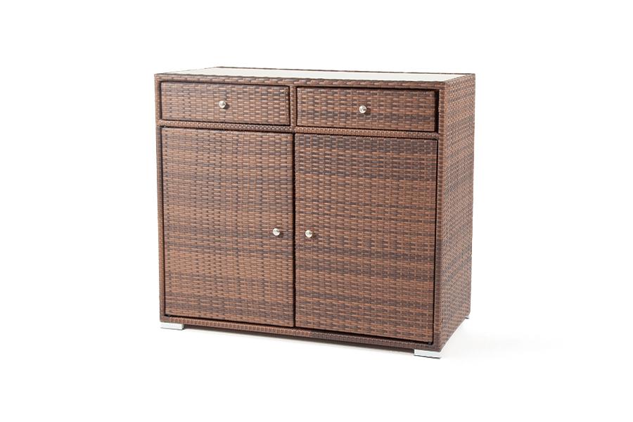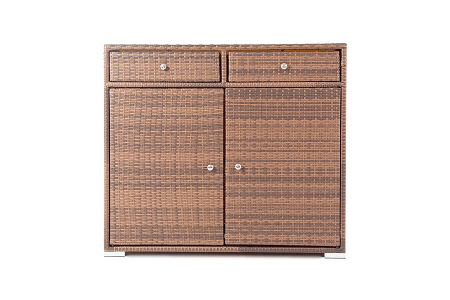 «Мальта» тумба изготовлена из алюминиевого каркаса, оплетенного плоским искусственным ротангом коричневого цвета. Размер - 1160×560×1020 мм. Тумба оснащена двумя выдвижными ящиками и двумя полками внутри. Закрывается на распашные дверцы.