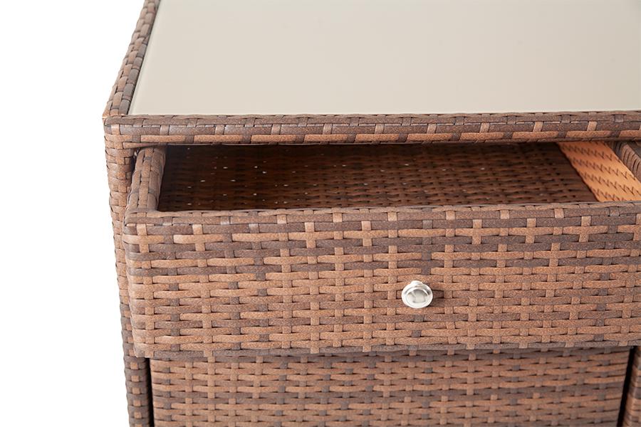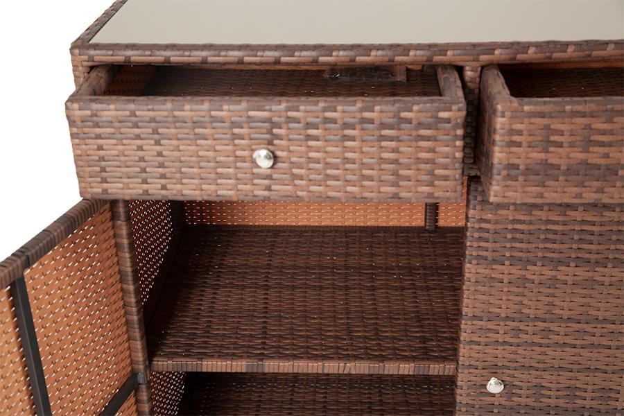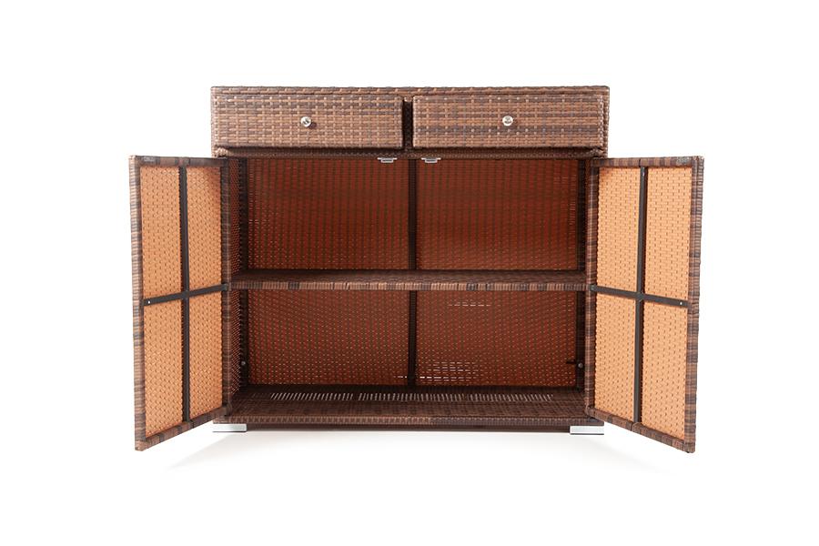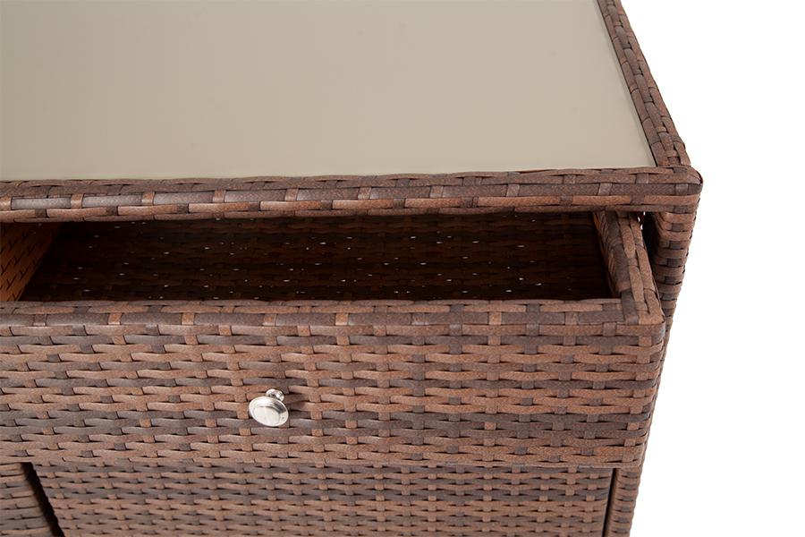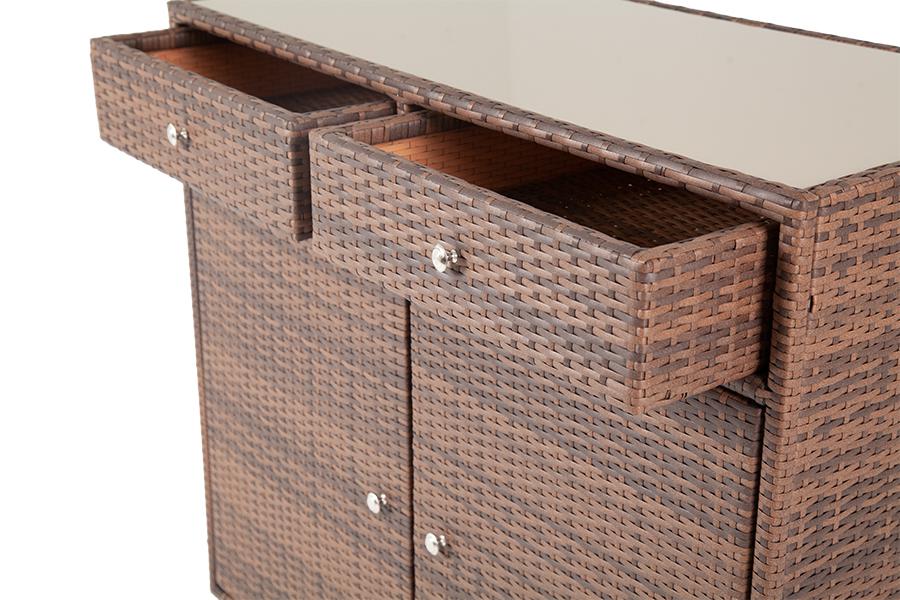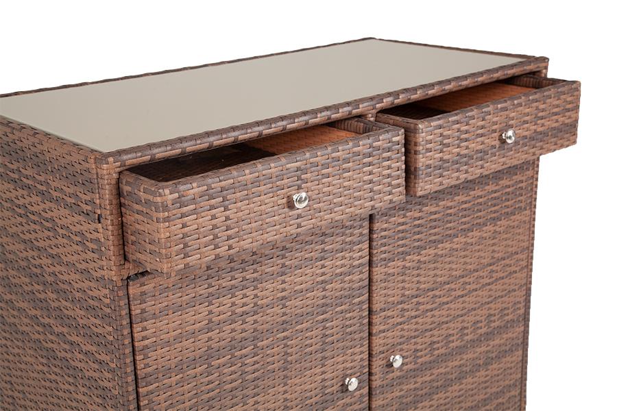 «Мальта» тумба изготовлена из алюминиевого каркаса, оплетенного плоским искусственным ротангом коричневого цвета. Размер - 1160×560×1020 мм. Тумба оснащена двумя выдвижными ящиками и двумя полками внутри. Закрывается на распашные дверцы.