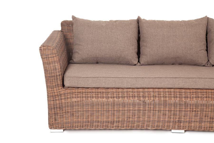 Диван «Капучино» предназначен для трех персон. Его основой является алюминиевый каркас. Размер модели – 2220×865×815 мм. Мебель дополняет круглое ручное плетение из искусственного ротанга. Оно представлено в коричневом цвете. В качестве практичного дополнения трехместного дивана выступают мягкие подушки. Они имеют съёмные чехлы в сером оттенке. При их пошиве используется полиэстер плотностью 300гр/м2. Материал предварительно обрабатывается влагоотталкивающей пропиткой. Параметры дивана без