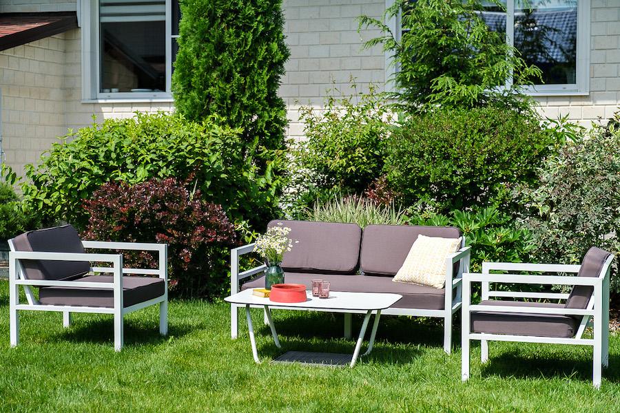 Стильный металлический диван «Эстелья» рассчитан на две персоны. Каркас изготовлен из легкого, но прочного алюминия, окрашенного в белый цвет порошковой краской. В копмлекте предусмотрены подушки темно-серого цвета со съёмными чехлами с влагоотталкивающей пропиткой. Ножки дивана оснащены пластиковыми наконечниками, с помощью которых можно отрегулировать равномерное расположение мебели. Размер двухместного дивана: 1480×760×730 мм. В линейке «Эстелья» есть также трехместный диван и кресла.