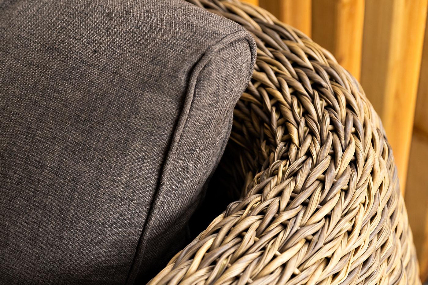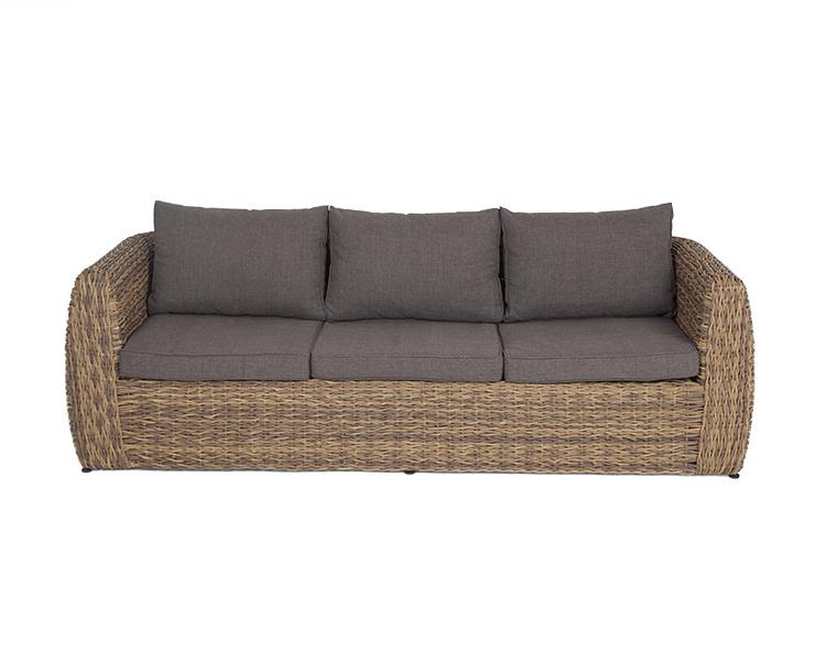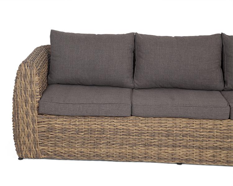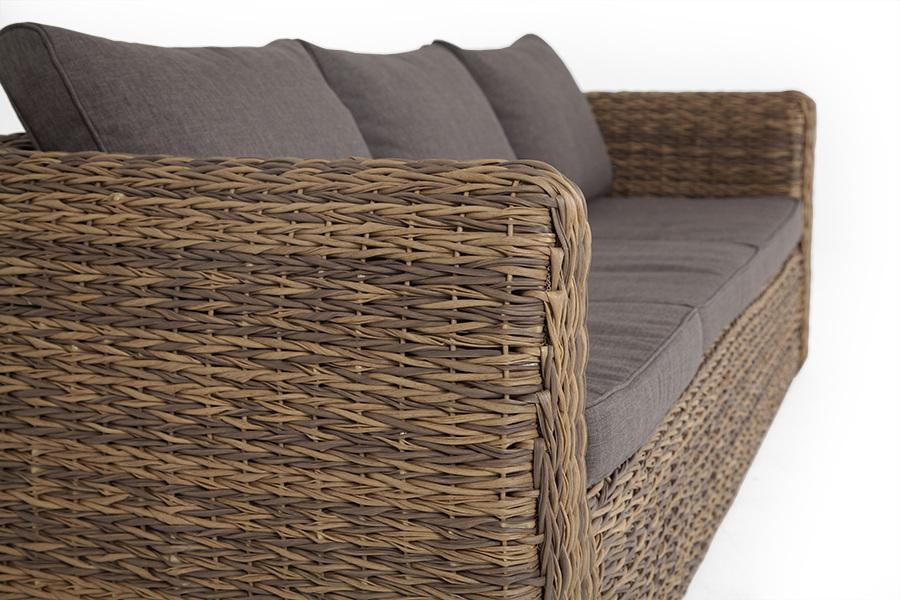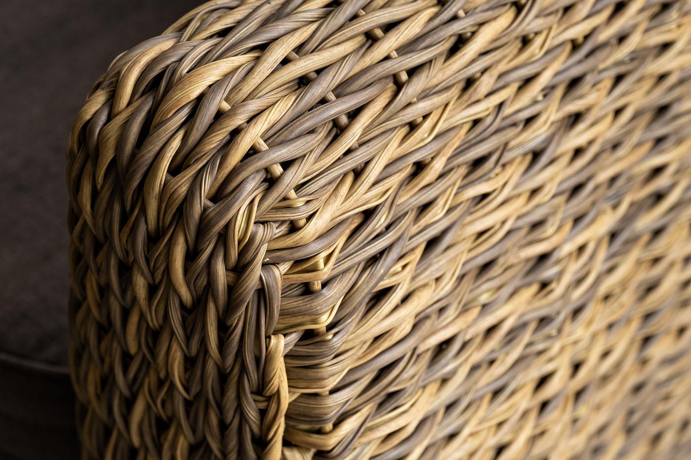 Диван «Кальяри» подходит для размещения сразу трех персон. Его основа из прочного алюминиевого каркаса. Размер модели – 2125×880×680 мм, толщина подушки: 80 мм, вес: 34 кг. Ручное круглое плетение является основным декоративным элементом мебели. Оно выполнено из искусственного ротанга вида «гиацинт» в соломенном цвете. В комплекте с трехместным диваном идут мягкие подушки для комфортного расположения. Чехлы съёмные серого цвета из высококлассного полиэстера с плотностью 300гр/м2. Защитные сво