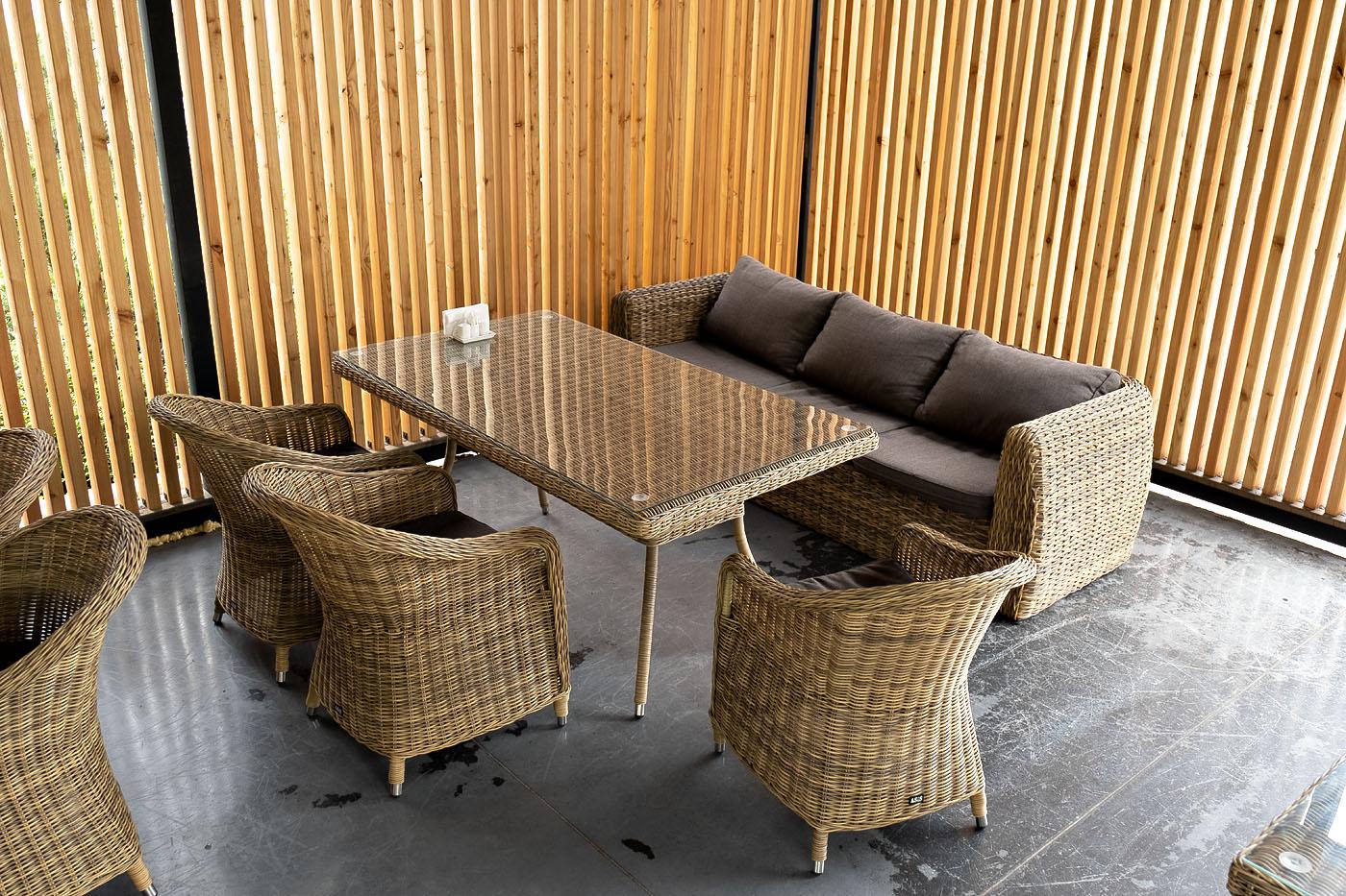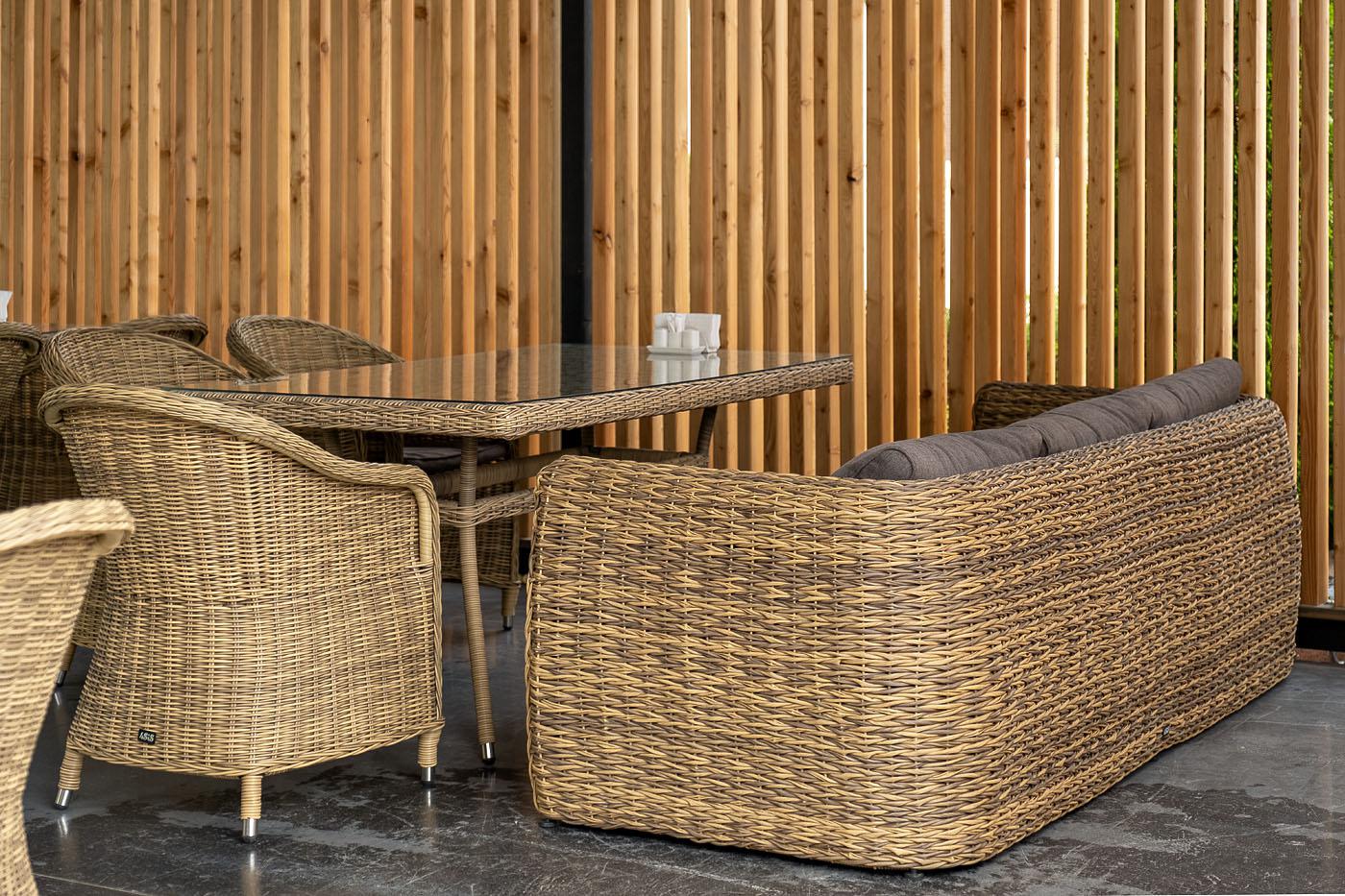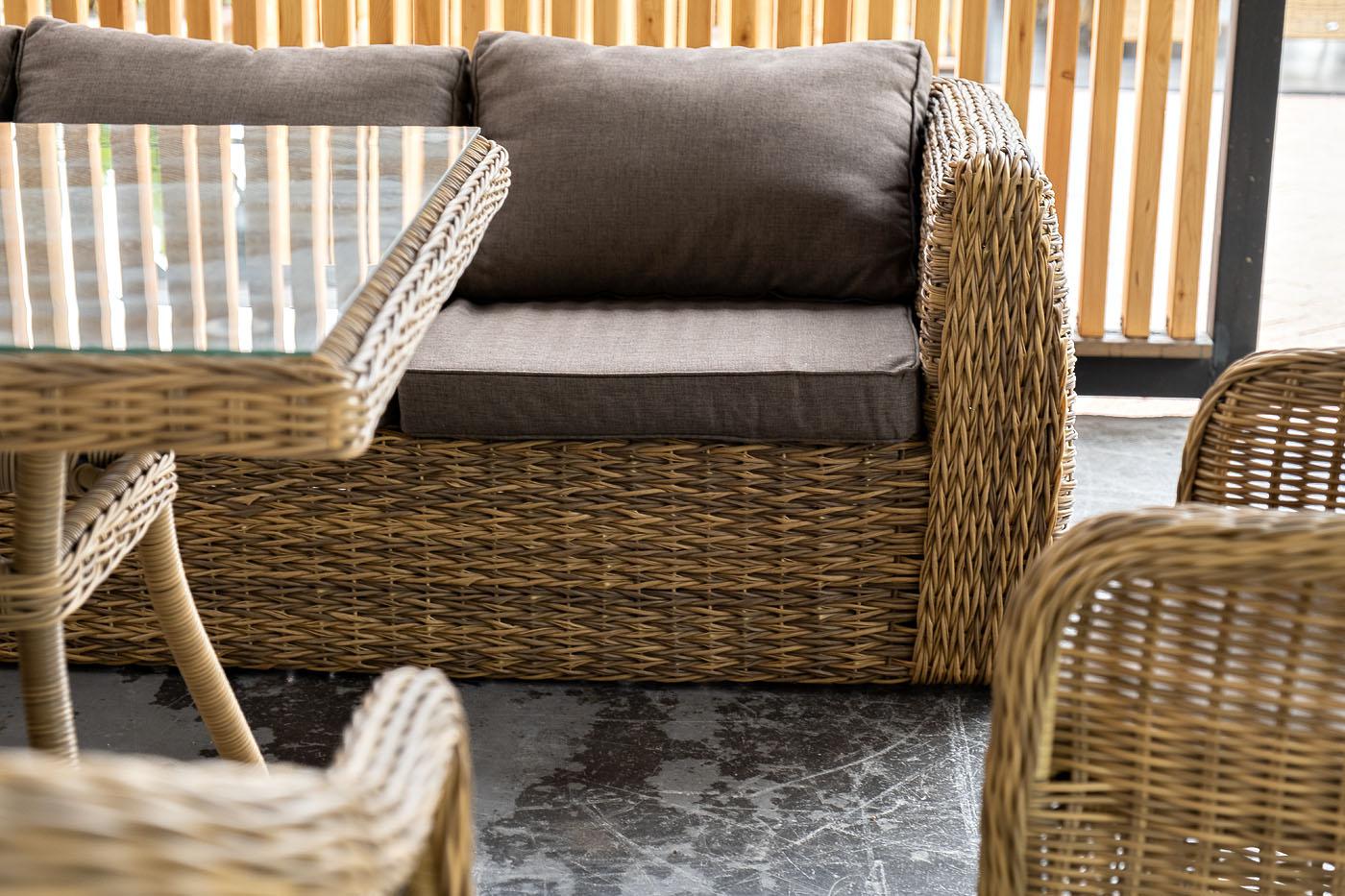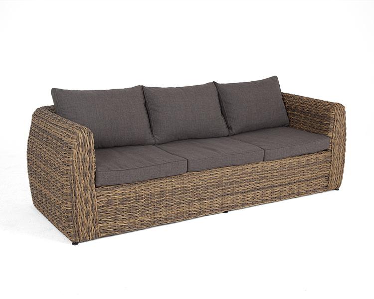 Диван «Кальяри» подходит для размещения сразу трех персон. Его основа из прочного алюминиевого каркаса. Размер модели – 2125×880×680 мм, толщина подушки: 80 мм, вес: 34 кг. Ручное круглое плетение является основным декоративным элементом мебели. Оно выполнено из искусственного ротанга вида «гиацинт» в соломенном цвете. В комплекте с трехместным диваном идут мягкие подушки для комфортного расположения. Чехлы съёмные серого цвета из высококлассного полиэстера с плотностью 300гр/м2. Защитные сво