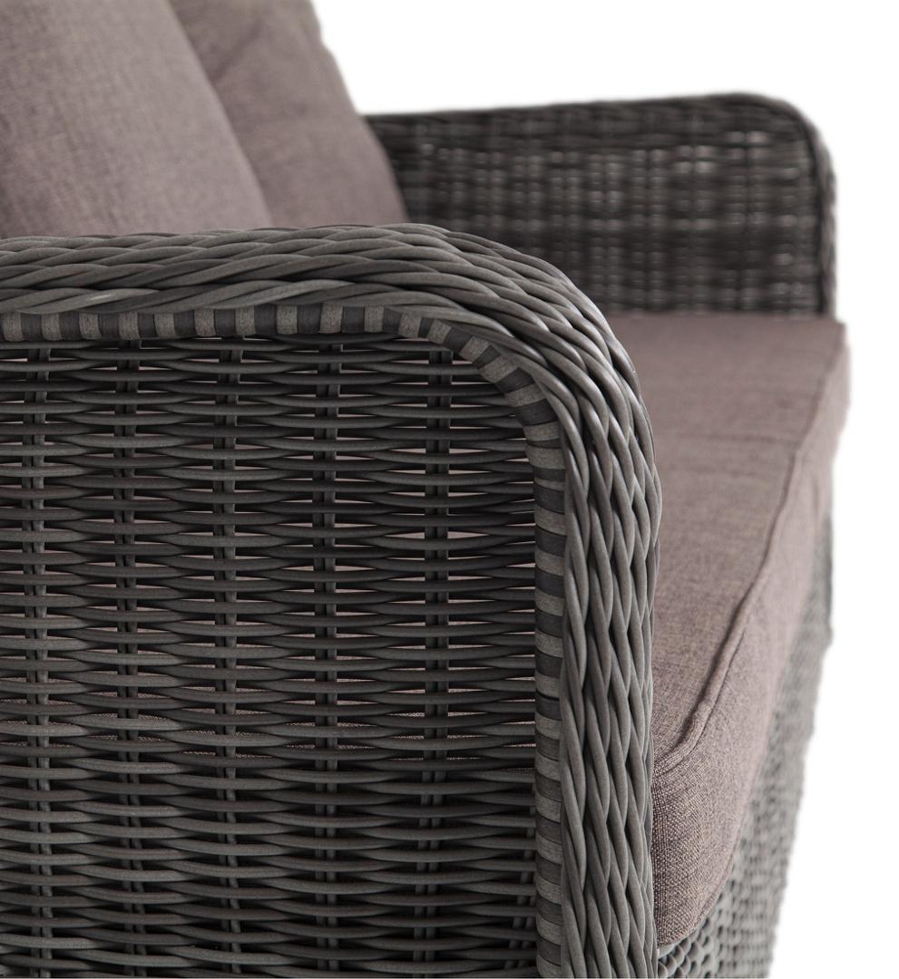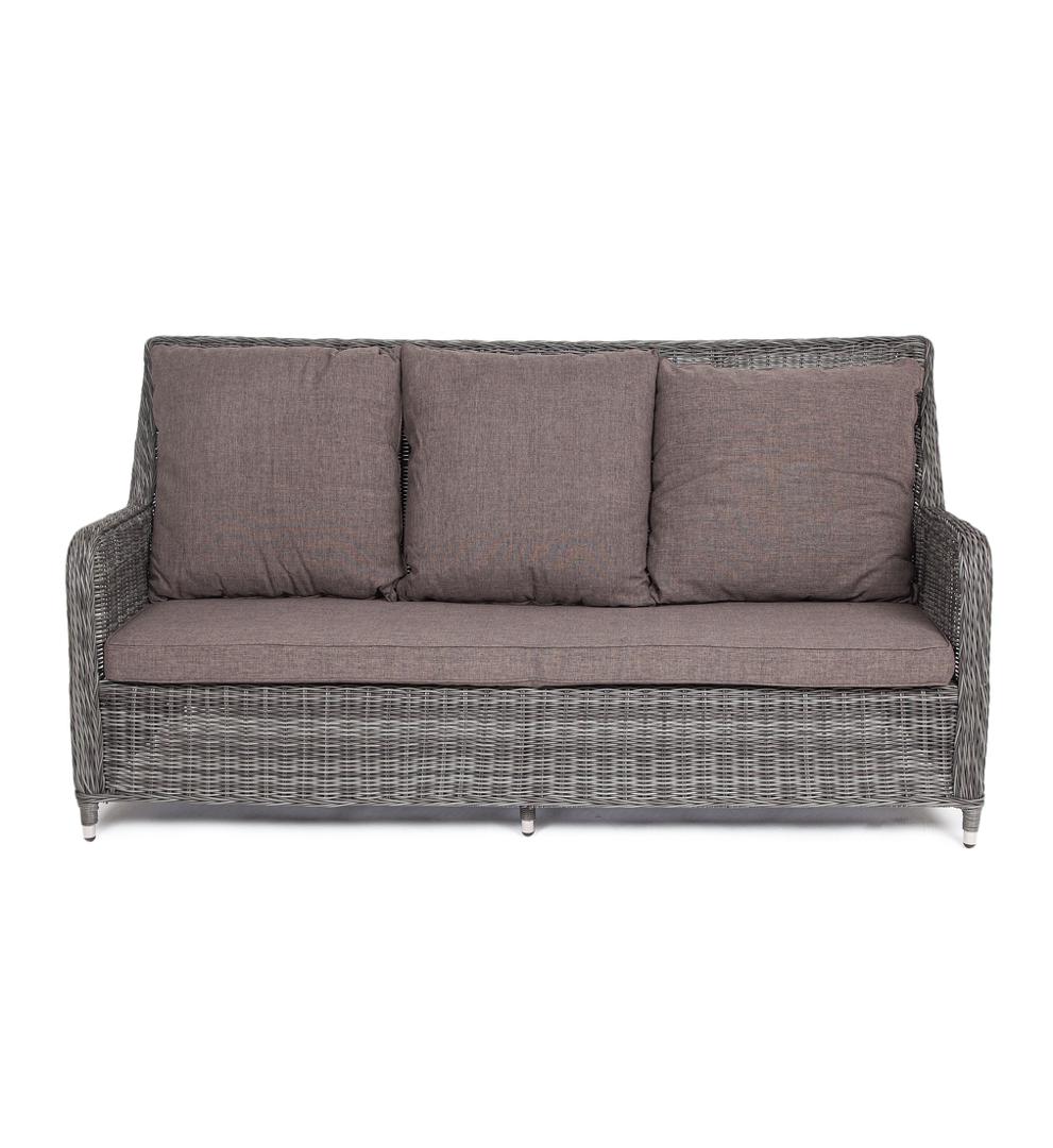 Диван «Гляссе» подходит для размещения сразу трех персон. Его основа из прочного алюминиевого каркаса. Размер модели – 1900×880×990 мм. Ручное круглое плетение является основным декоративным элементом мебели. Оно выполнено из искусственного ротанга в цвете графит. В комплекте с трехместным диваном идут мягкие подушки для комфортного расположения. Чехлы съёмные серого цвета из высококлассного полиэстера с плотностью 300гр/м2. Защитные свойства ткани усиливаются при помощи влагоотталкивающ