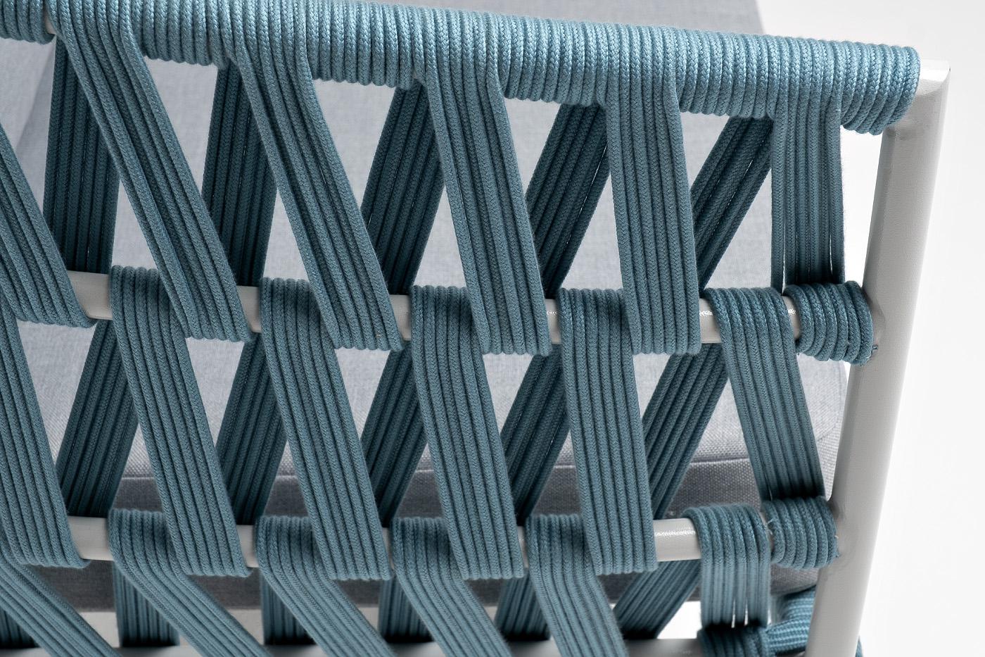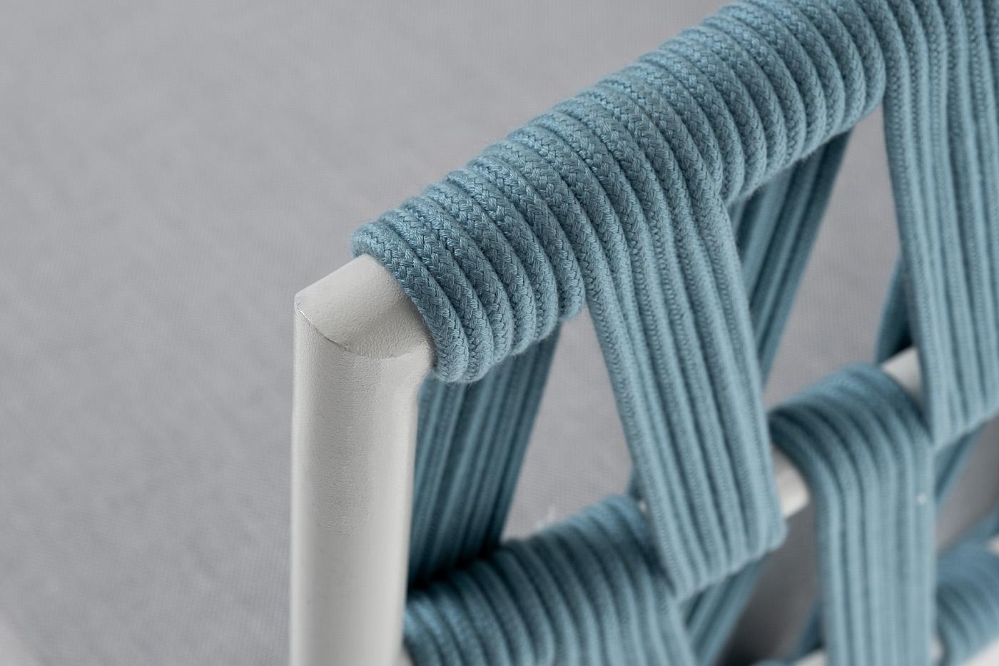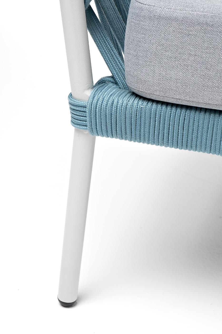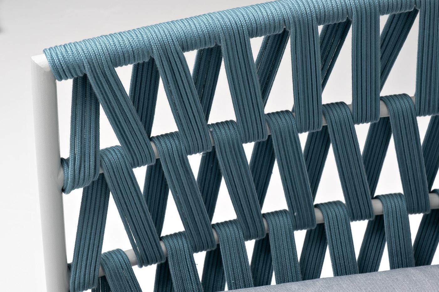 Двухместный диван «Диего» с подушками в комплекте. Диван имеет алюминиевый каркас, окрашенный порошковой краской в светло-серый (RAL7035) цвет. Боковины каркаса и спинка вручную оплетены роупом - эластичными синтетическими лентами, изготовленными из высокопрочных полиэфирных волокон. Цвет оплетки - бирюзовый. Подушки состоят из наполнителя и съёмных чехлов, которые обработаны влагоотталкивающей пропиткой светло-серого цвета. Материал - 100% полиэстер, плотностью 300гр/м2. Размер плетеного дивана: 1580×720×770 мм.