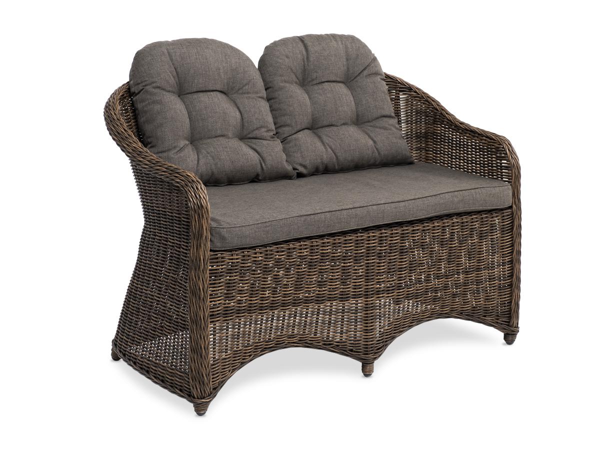 Садовый двухместный диван «Равенна» с подушками в комплекте. Диван выполнен из круглого искусственного ротанга, в основе алюминиевый каркас. Цвет коричневый. Подушки с влагоотталкивающими съёмными чехлами. Размер плетеного дивана - 1180×680×810 мм. Параметры дивана без подушек: Глубина сидения – 500 мм; Высота сидения – 440 мм; Высота спинки – 400 мм.