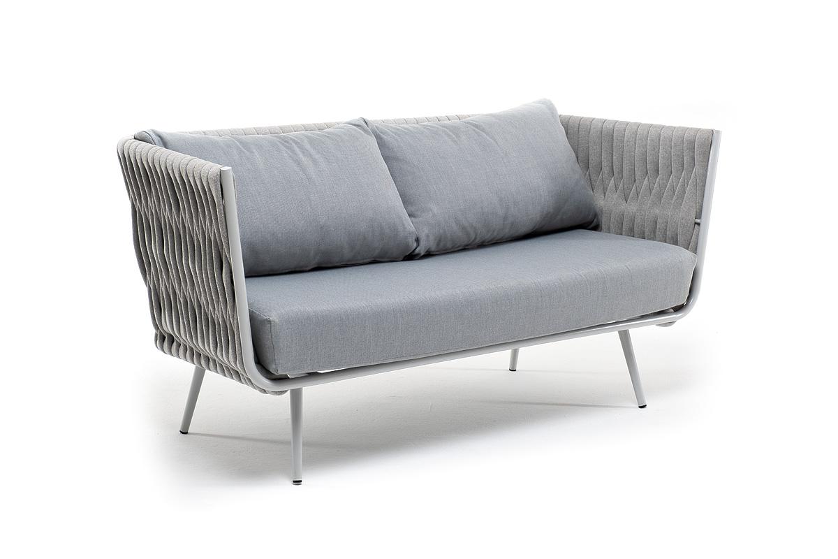 Двухместный диван «Монако» с подушками в комплекте. Диван имеет алюминиевый каркас, окрашенный порошковой краской в светло-серый (RAL7035) цвет. Боковины каркаса и спинка вручную оплетены роупом - эластичными синтетическими лентами, изготовленными из высокопрочных полиэфирных волокон. Цвет оплетки - светло-серый. Подушки состоят из наполнителя и съёмных чехлов, которые обработаны влагоотталкивающей пропиткой светло-серого цвета. Материал - 100% полиэстер, плотностью 300гр/м2. Размер плетеног
