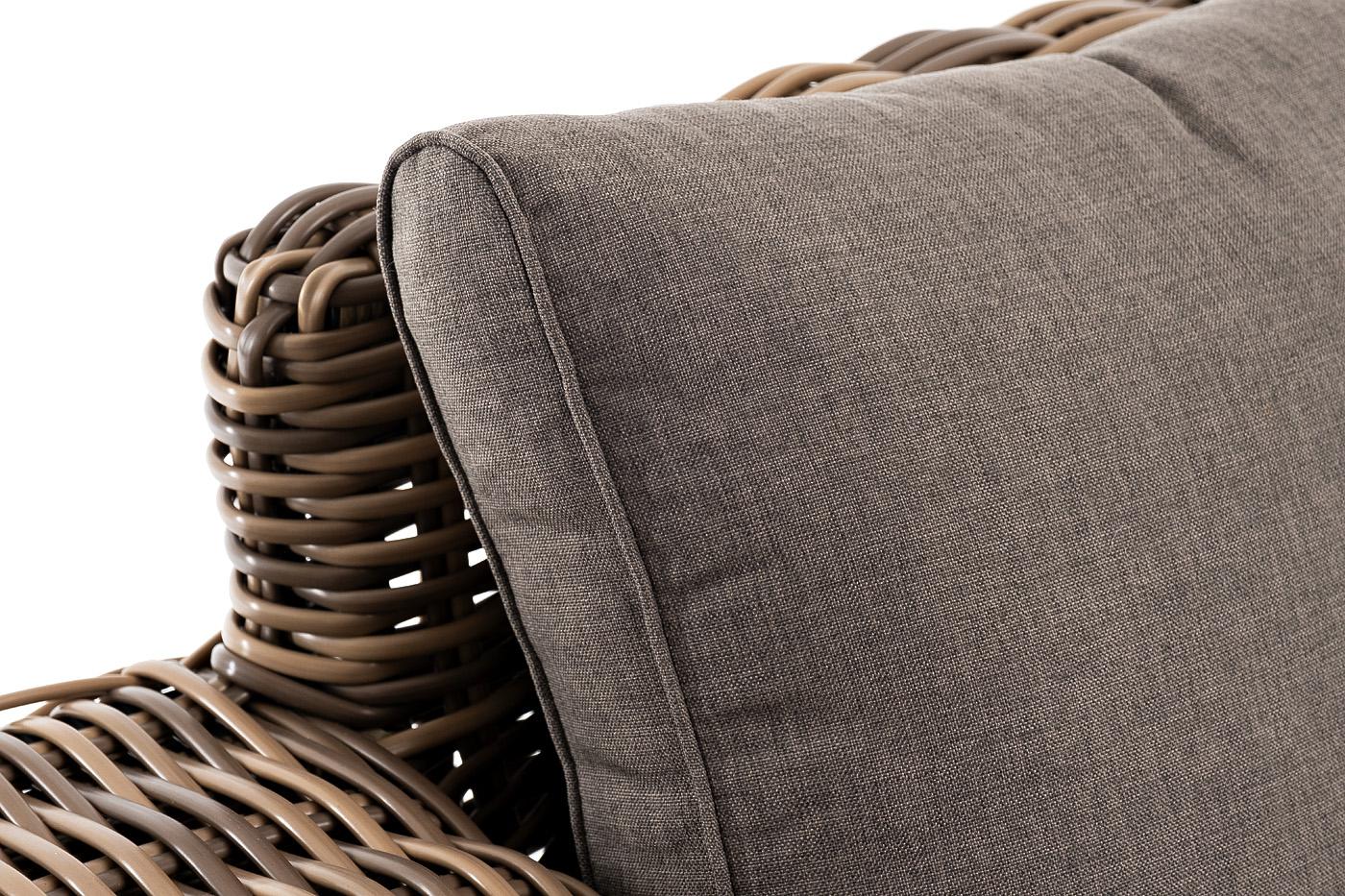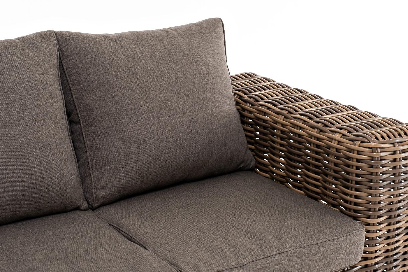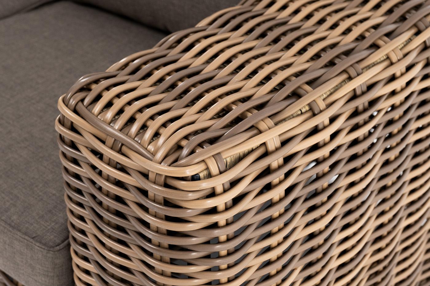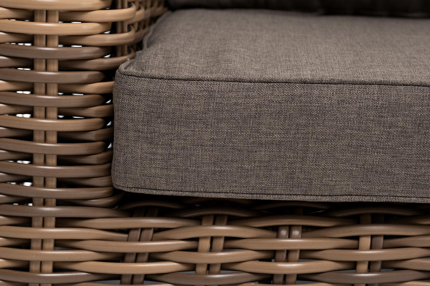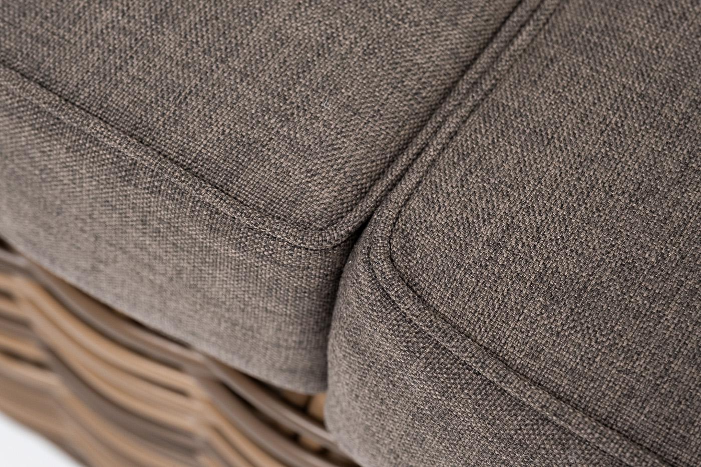 Диван «Палермо» подходит для размещения сразу трех персон. Его основа из прочного алюминиевого каркаса. Ручное круглое плетение является основным декоративным элементом мебели. Оно выполнено из искусственного ротанга в соломенном цвете. В комплекте с трехместным диваном идут мягкие подушки для комфортного расположения. Чехлы съёмные серого цвета из высококлассного полиэстера с плотностью 300гр/м2. Защитные свойства ткани усиливаются при помощи влагоотталкивающей пропитки. Размеры дивана: 23