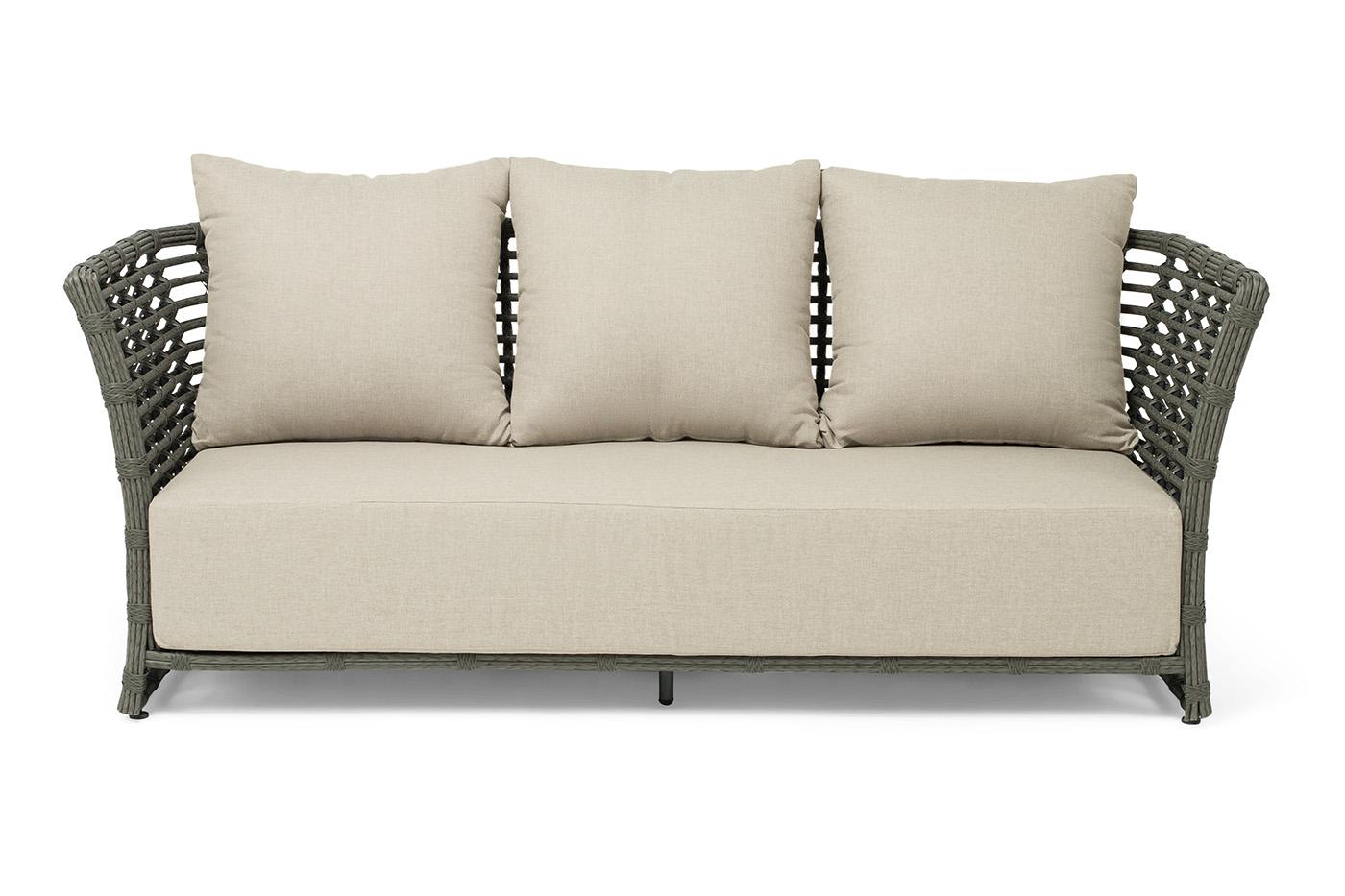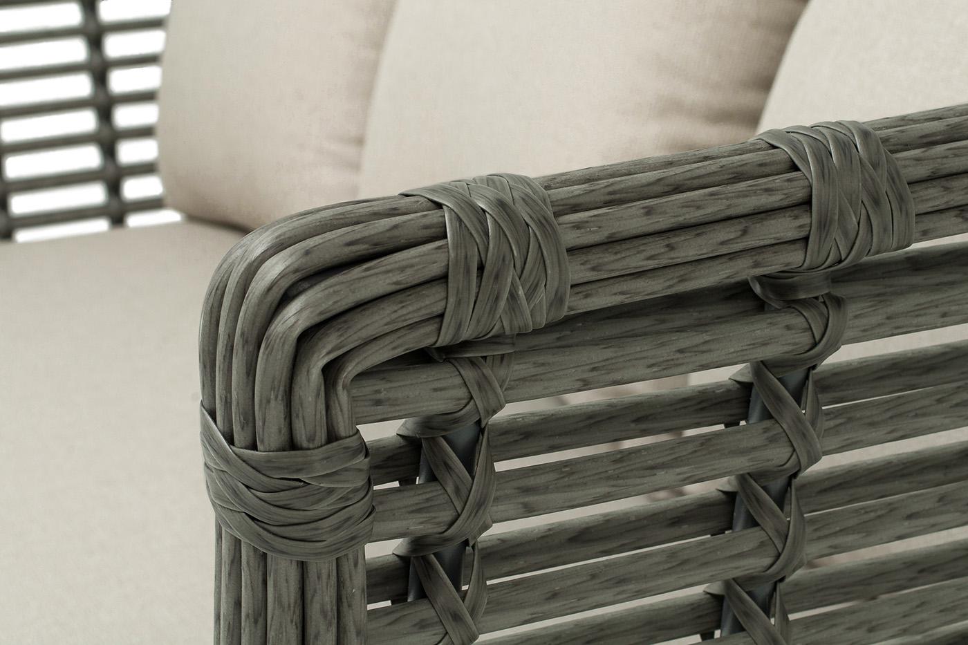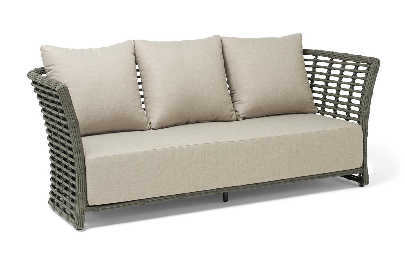 Диван «Валенсия» подходит для размещения сразу трех персон. Его основа из прочного алюминиевого каркаса. Ручное круглое плетение является основным декоративным элементом мебели. Оно выполнено из искусственного ротанга в сером цвете. В комплекте с трехместным диваном идут мягкие подушки для комфортного расположения. Чехлы съёмные бежевого цвета из высококлассного полиэстера с плотностью 300гр/м2. Защитные свойства ткани усиливаются при помощи влагоотталкивающей пропитки. Размер модели – 2020
