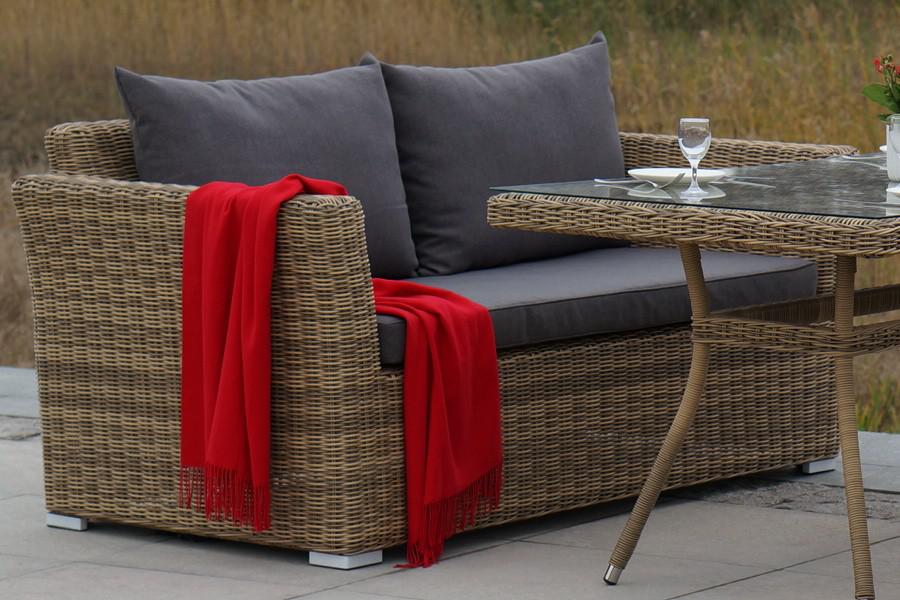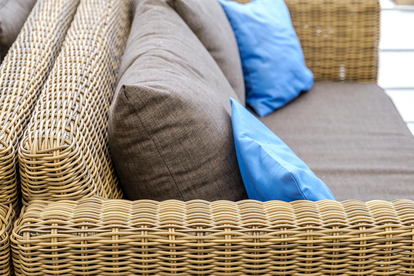 Диван «Капучино» двухместный с каркасом из прочного алюминия. Размер модели – 1700×865×815 мм. Диван выполнен из круглого искусственного ротанга соломенного цвета, оплетенного вручную. Двухместный диван дополнен несколькими подушками со съёмными чехлами серого цвета. Они изготовлены из прочного полиэстера, плотность которого достигает 300гр/м2. Предусмотрена влагоотталкивающая пропитка ткани для защиты текстильных изделий от намокания. Параметры дивана без подушек: Глубина сидения – 6